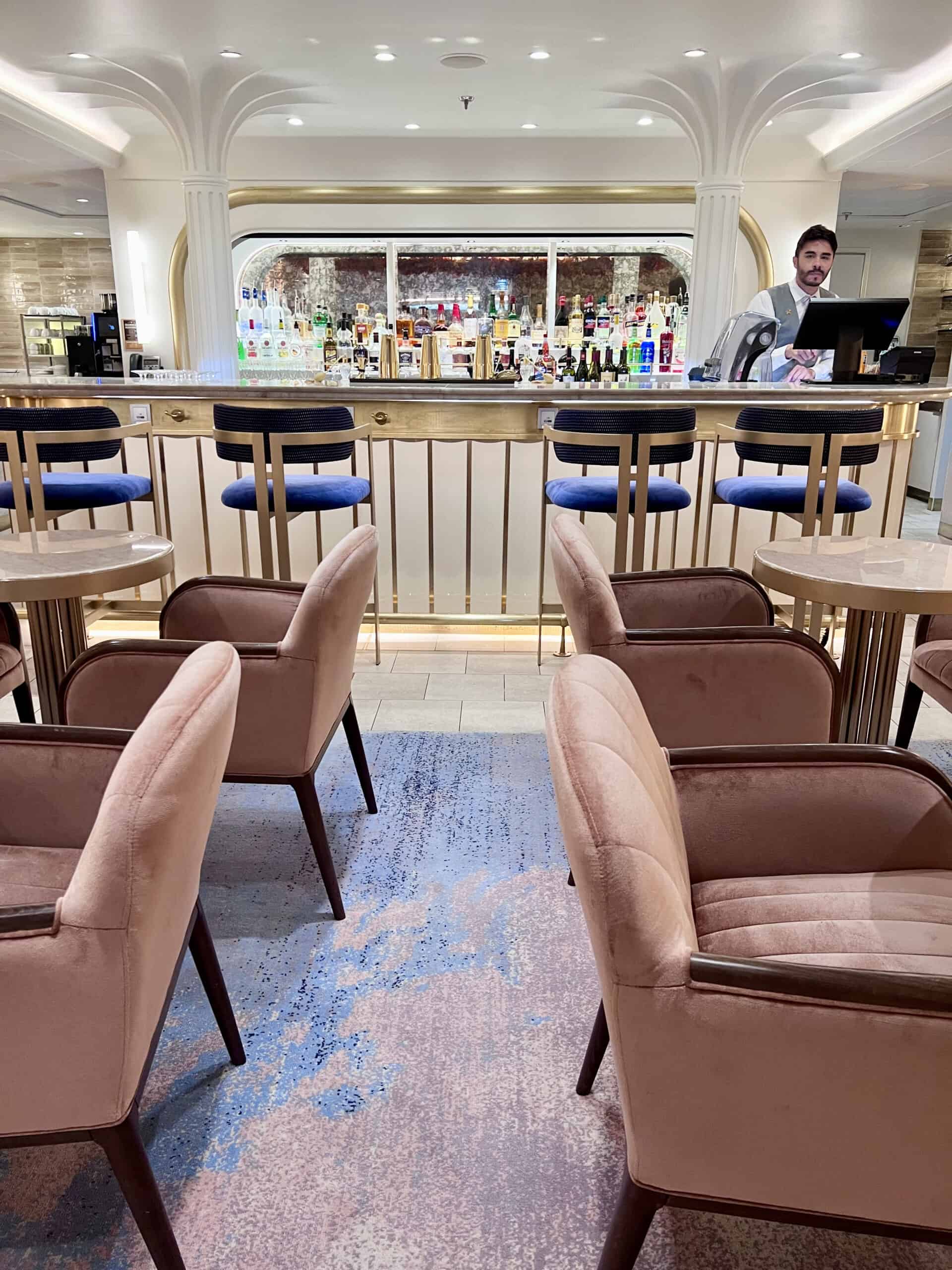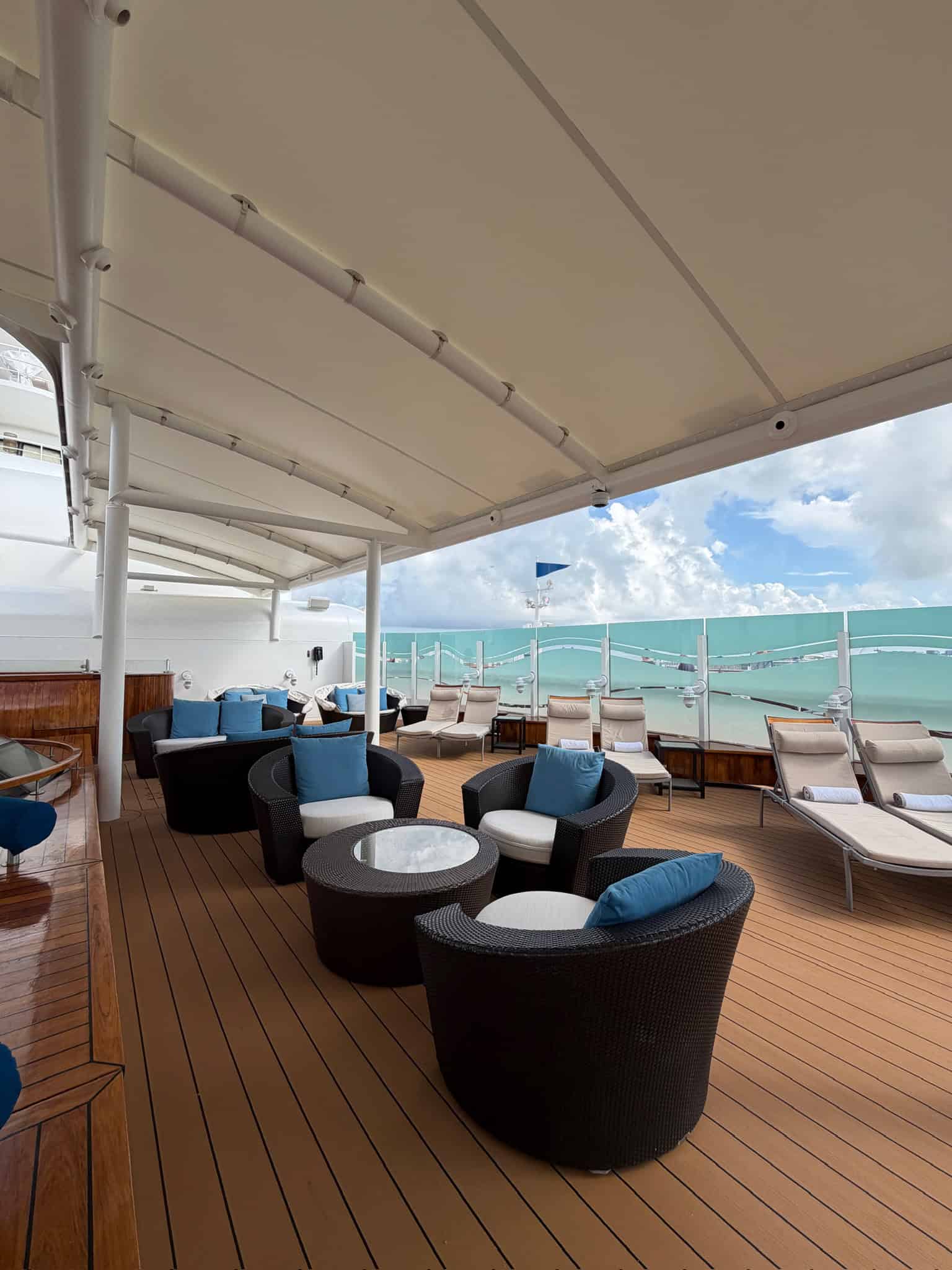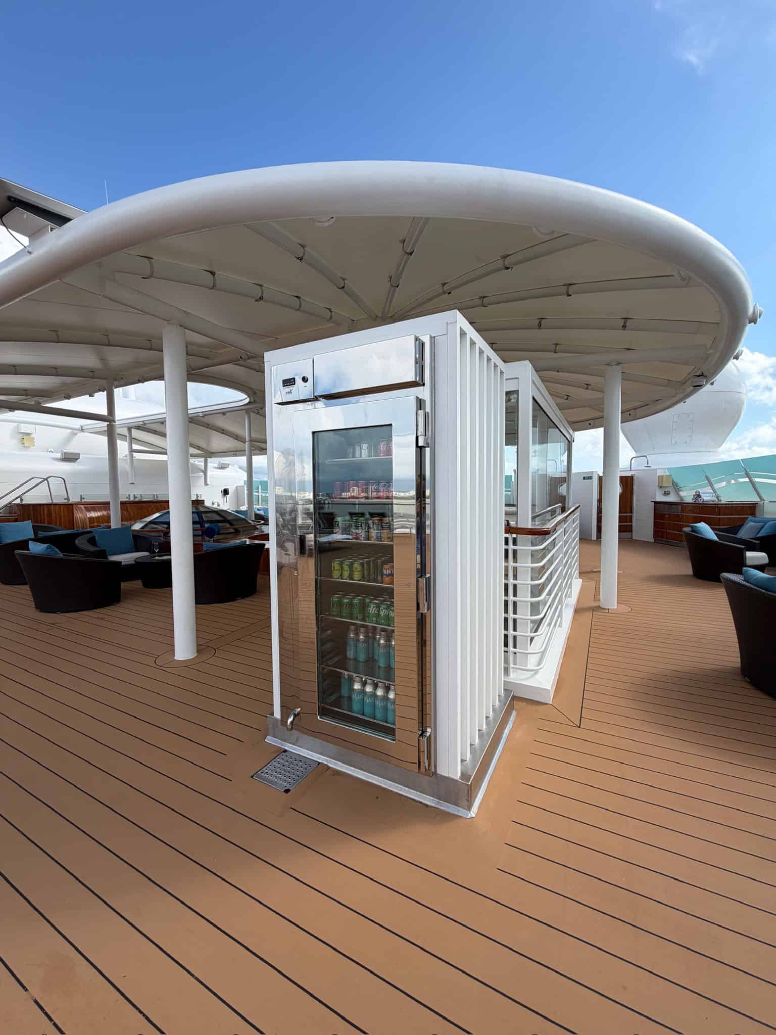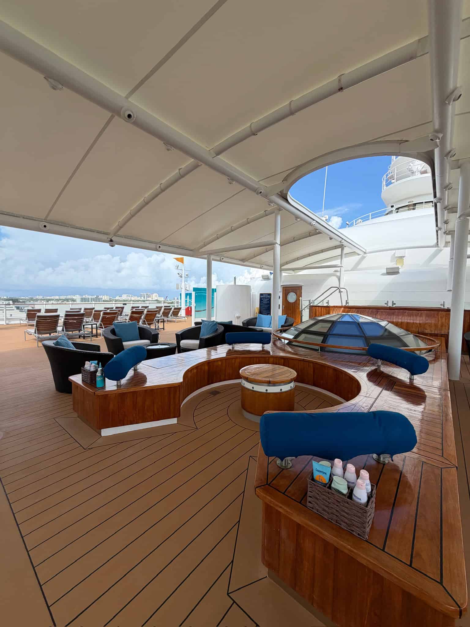 Just upstairs from the lounge is the dedicated concierge sundeck. It’s quiet, calm and never crowded. There are loungers, shaded spaces, hot tubs, towels, sunscreen, cool towels on hot days, and even a Dole Whip smoothie available at no additional charge. On sea days, a cash bar operates so you can avoid long lines on the busy pool decks. The views are spectacular.