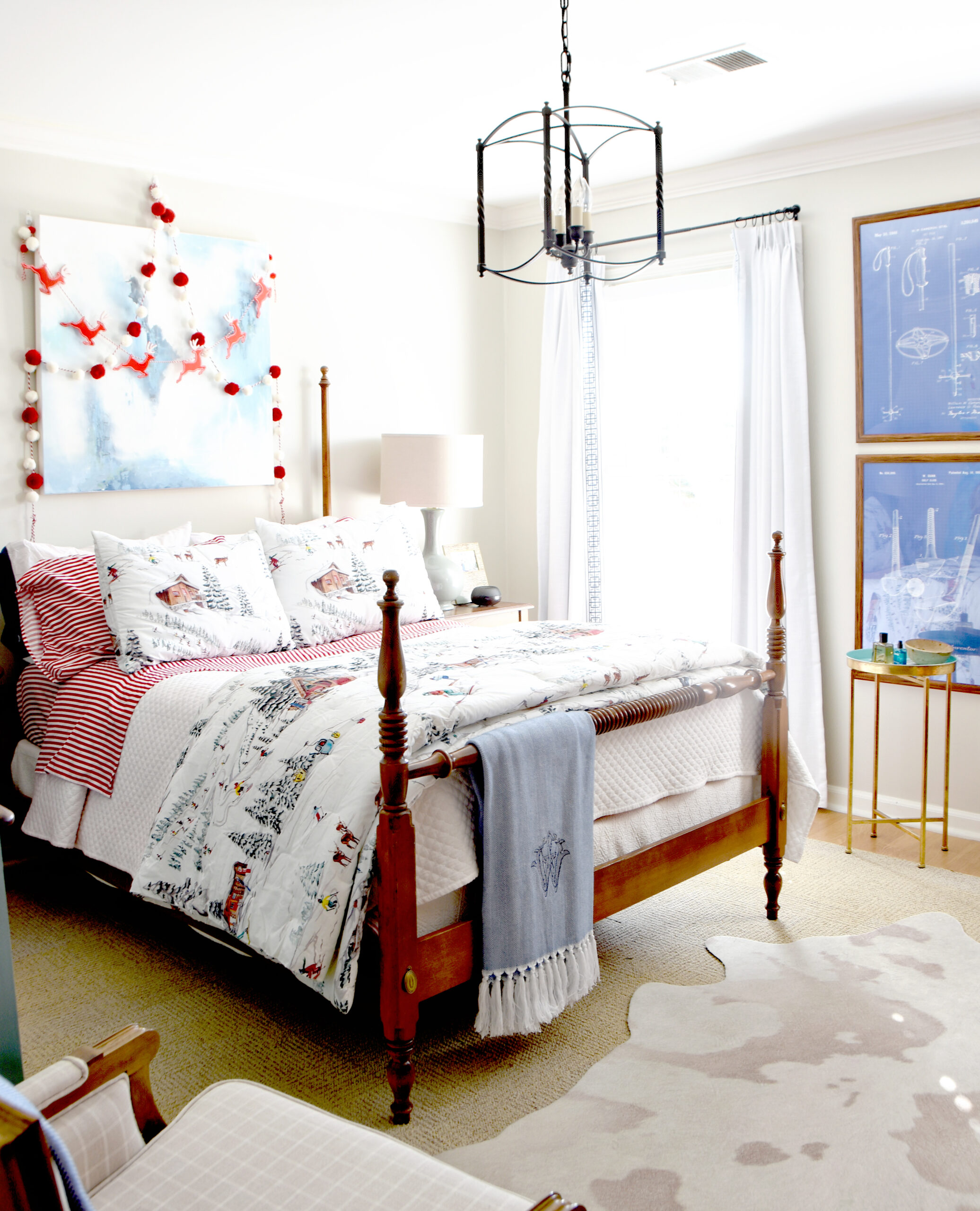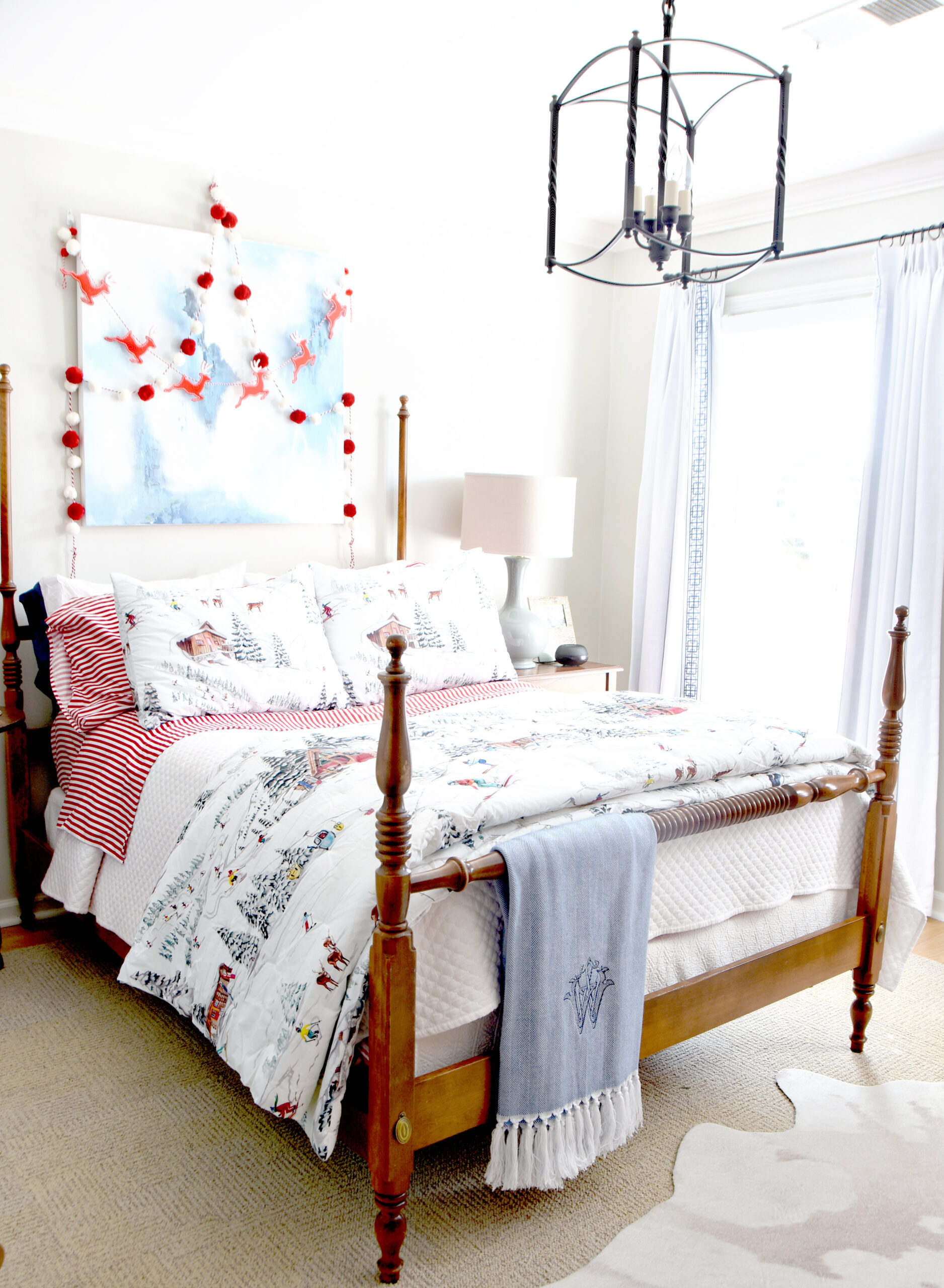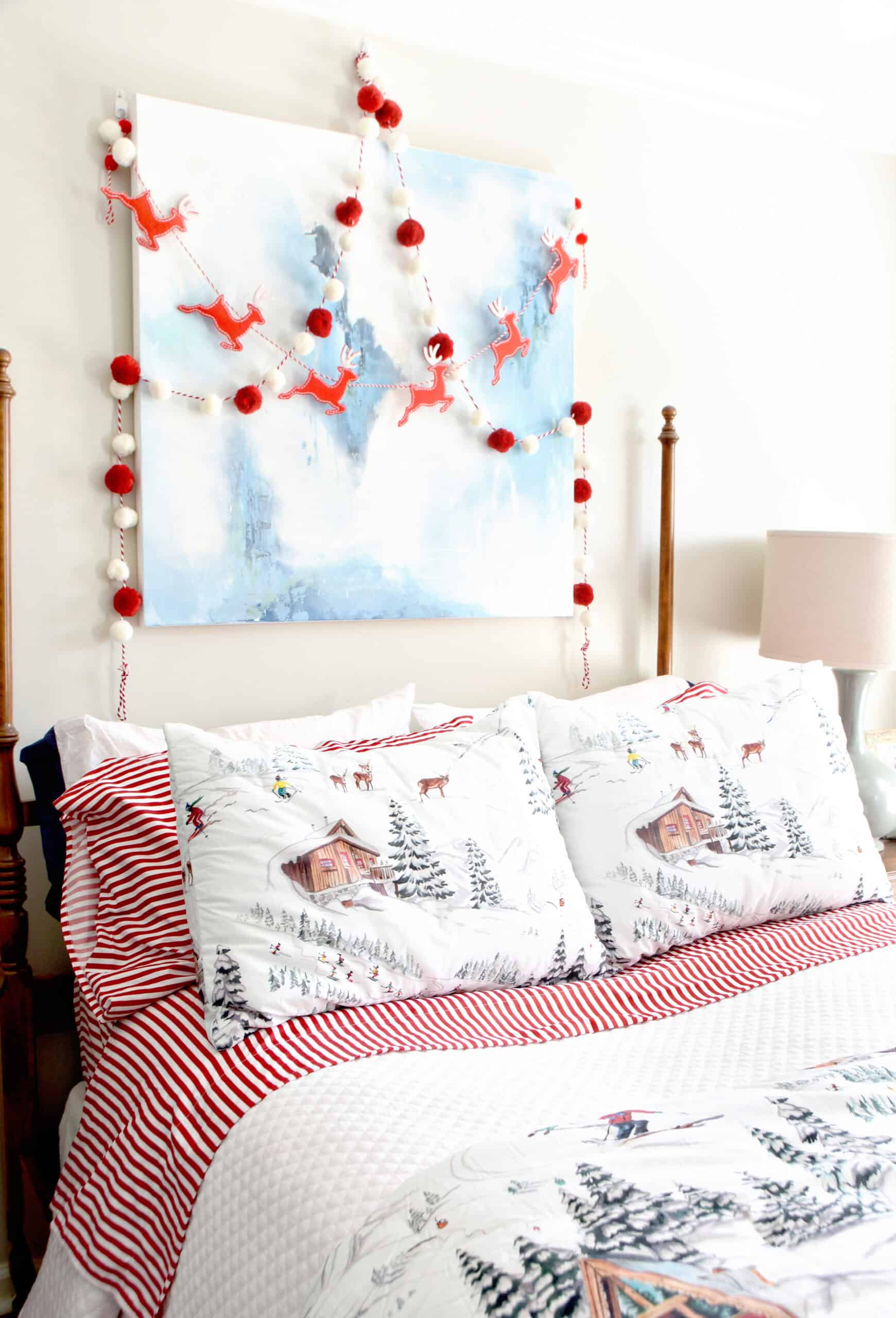 Last year we ordered ski-themed Christmas bedding that didn’t arrive in time, so we were excited to finally see it make its debut this season. Instead of the colorful garlands we’ve used in the past, I opted for simple red-and-white garlands that had previously lived out in the cabana, hung easily with command hooks.