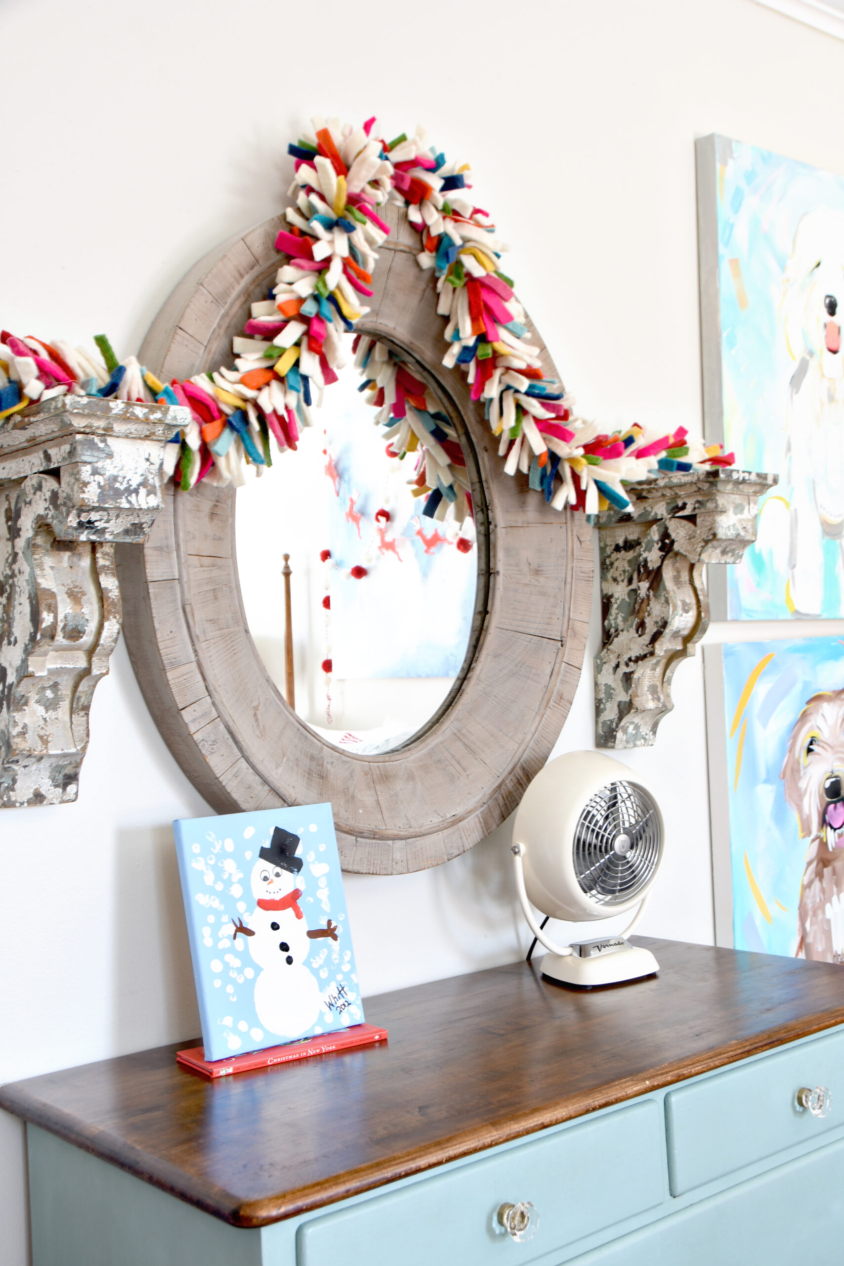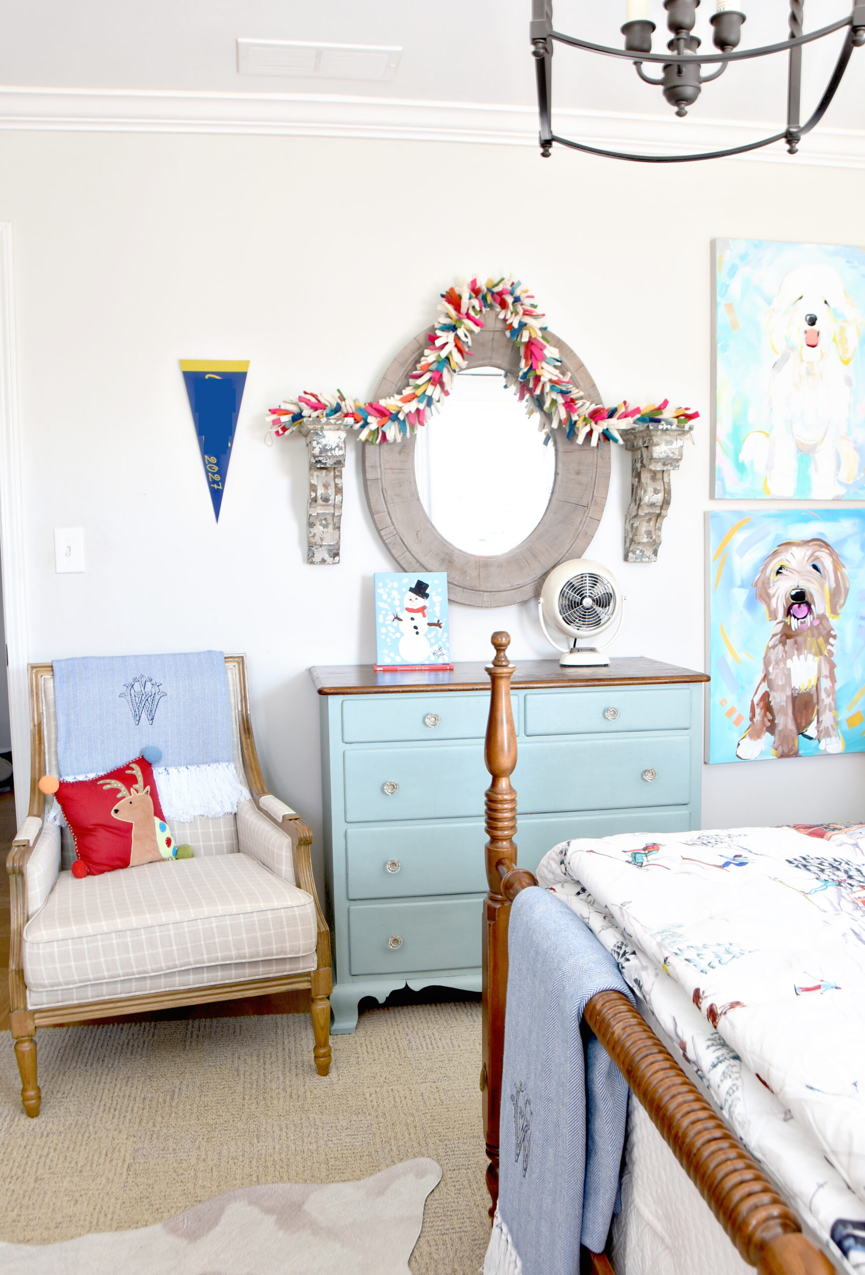 On the other side of the room sits his dresser, which once belonged to Honey as a child, and the chair we temporarily relocate to make space for the tree. When we revamped the room, we moved Whit’s Anna and Elsa paintings to a quieter corner. He wasn’t quite ready to part with them altogether, and I completely understand.