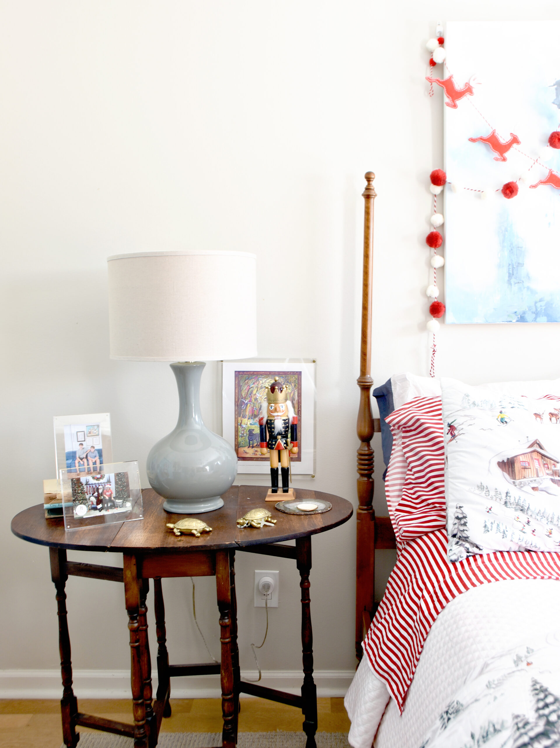 The felt garland from Pottery Barn still hangs nearby, along with another piece of Whit’s artwork. It’s hard to believe he was just four years old when he carried it home, and now here we are, celebrating Christmas with a seventeen year old. His bedside table gets a few festive touches as well, and the final view of the room looks toward his bookshelf, filled with favorite reads and meaningful keepsakes.