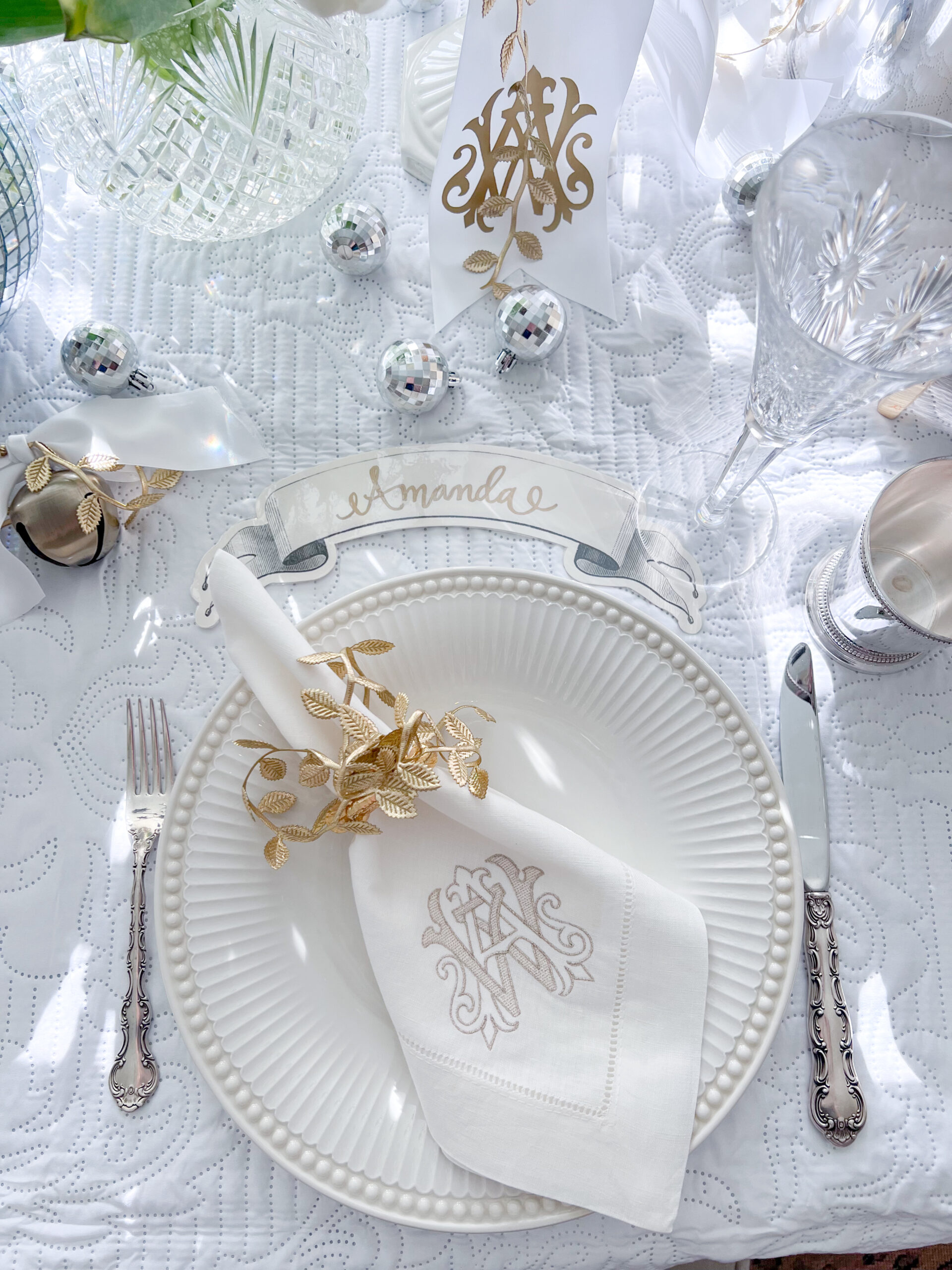 The white linen napkins with a metallic gold monogram were a Christmas gift to myself a few years ago and I still love them. I paired them with my gold bamboo napkin rings and tied gold leaf ribbon in a bow at the top of each one. The place cards have been in my collection for years. I laminated them long ago and we reuse them often.