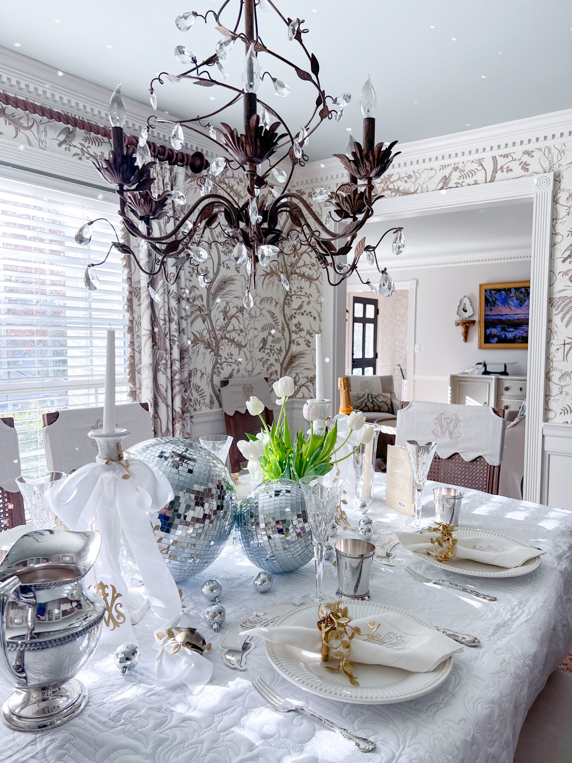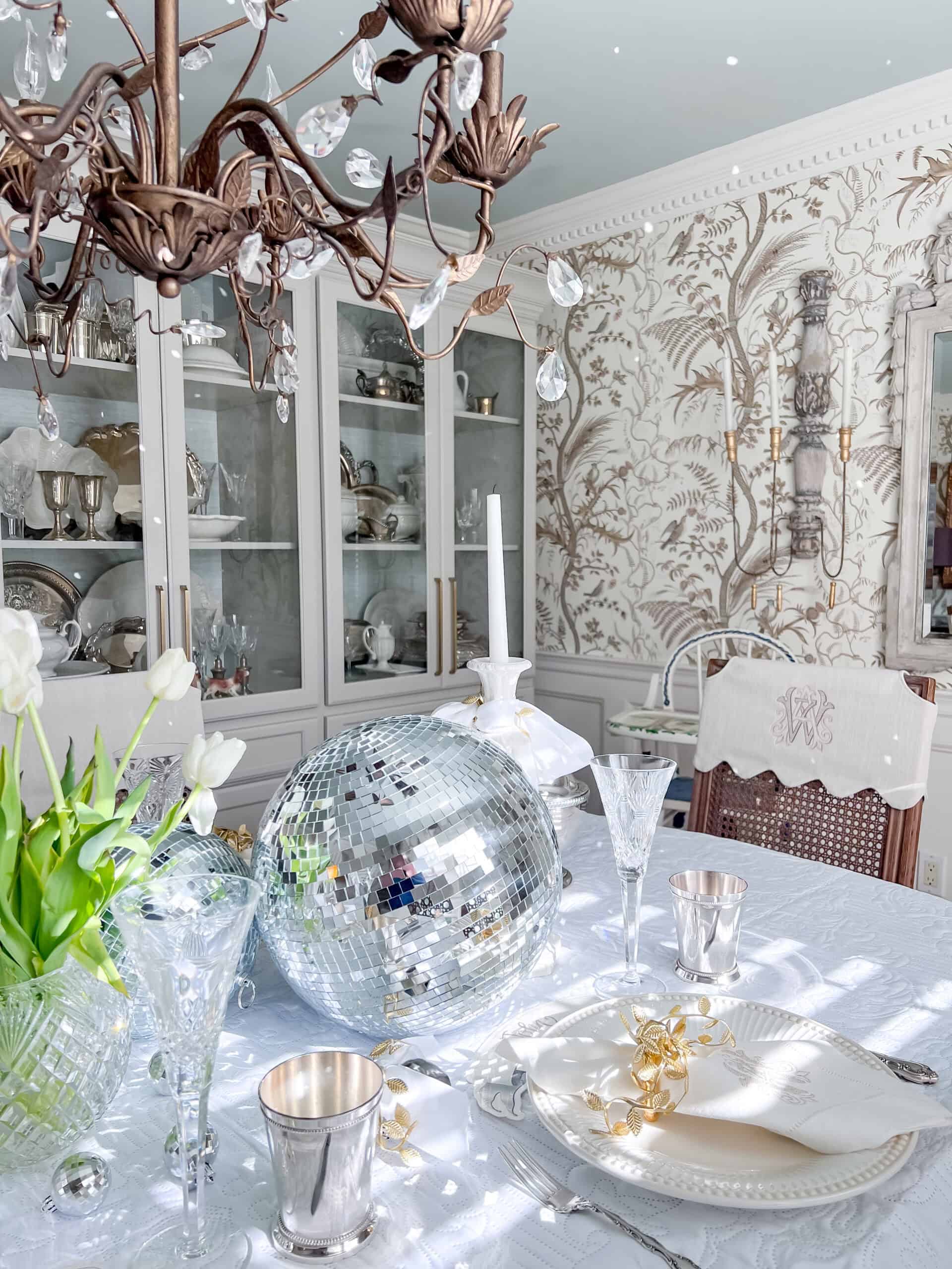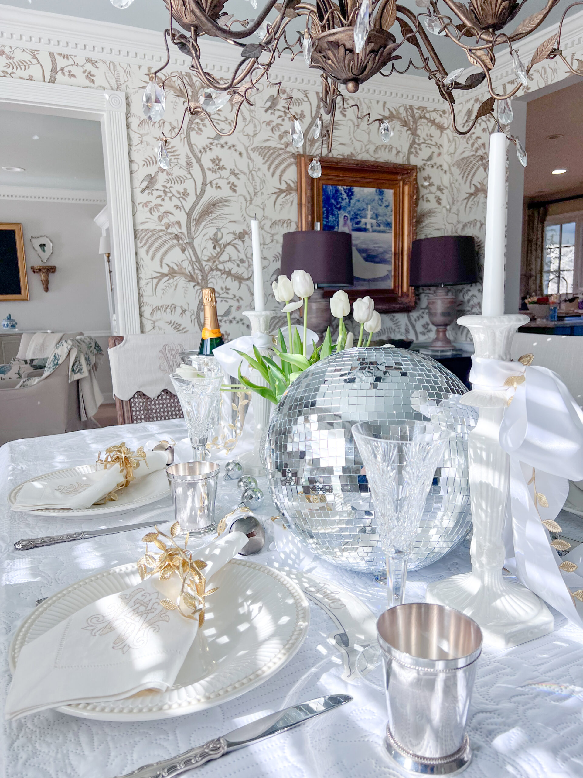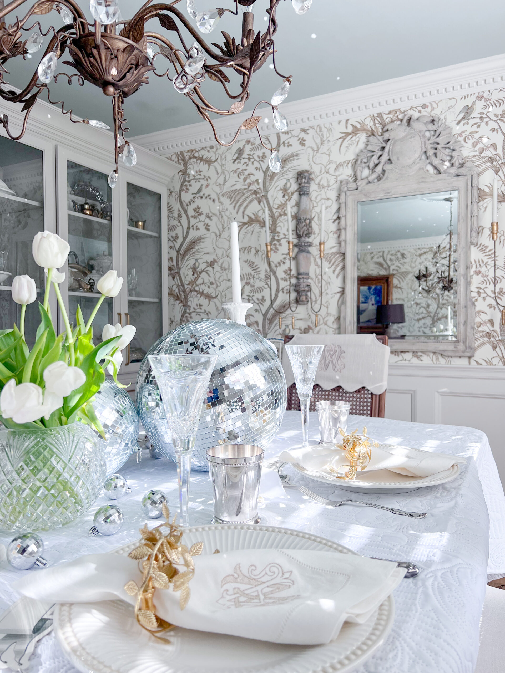 Here’s a peek at my New Year’s table in the dining room. Once again, the disco balls made an appearance. They were the centerpiece of our New Year feast table and reflect joy all around the room all day long!