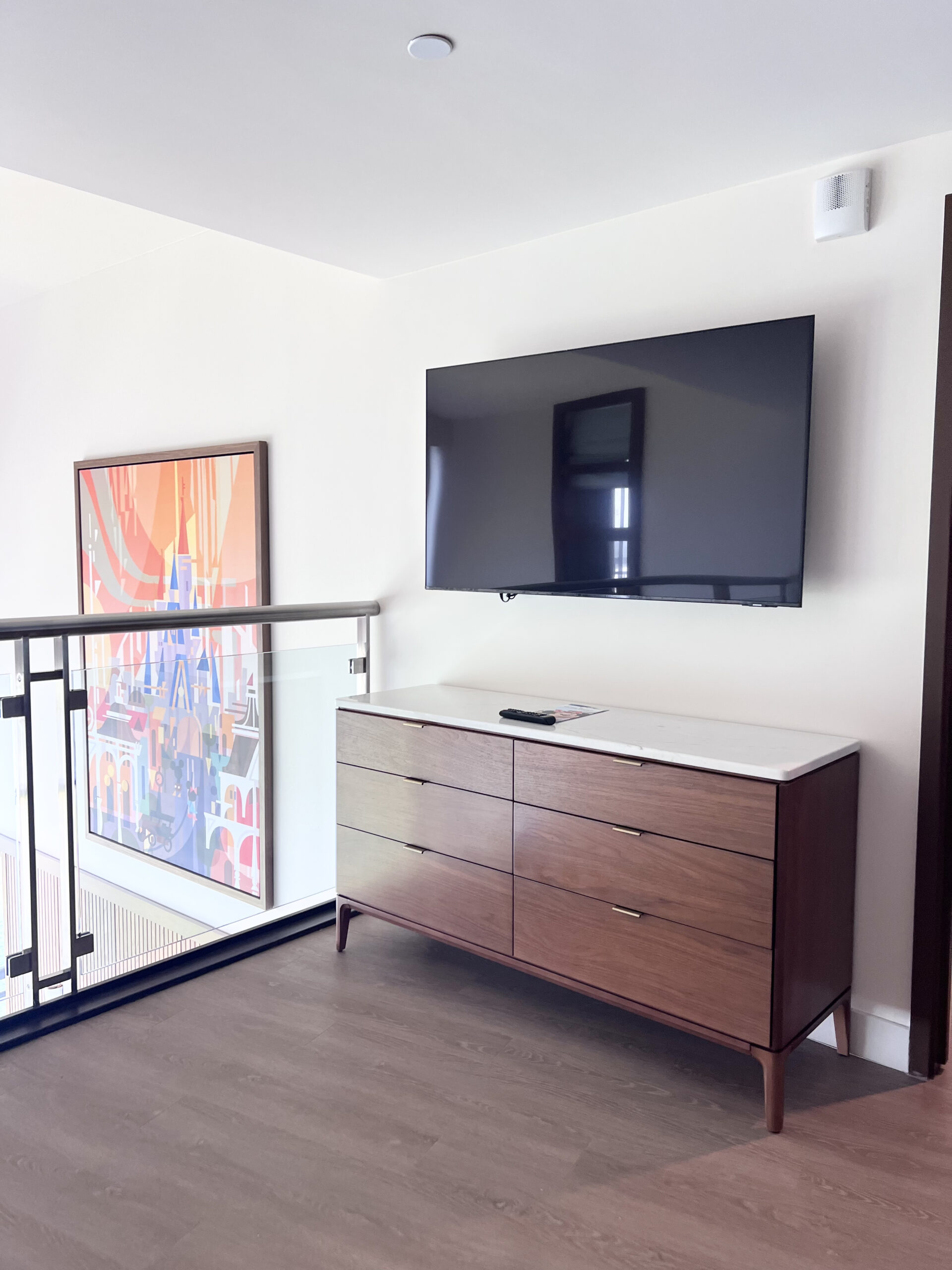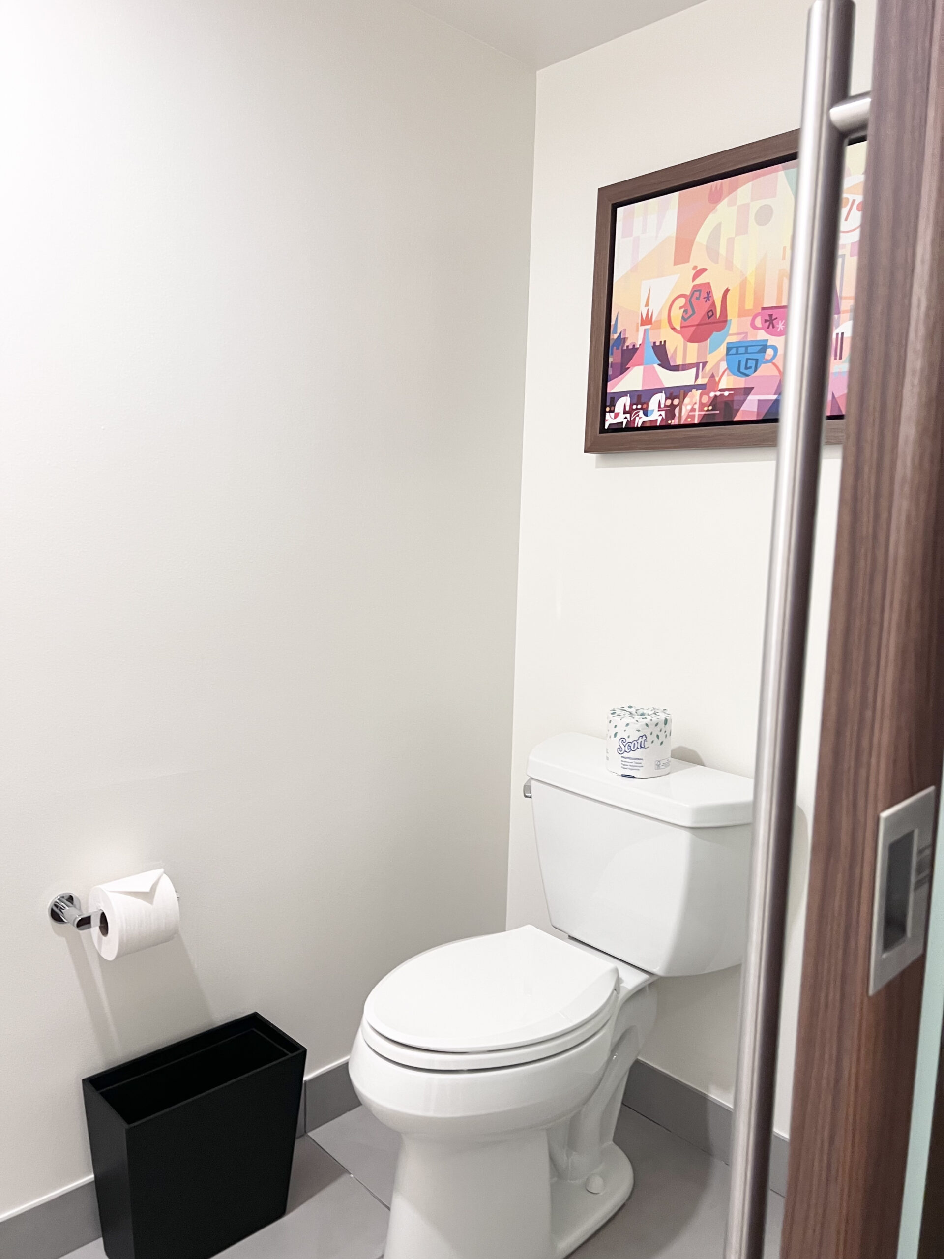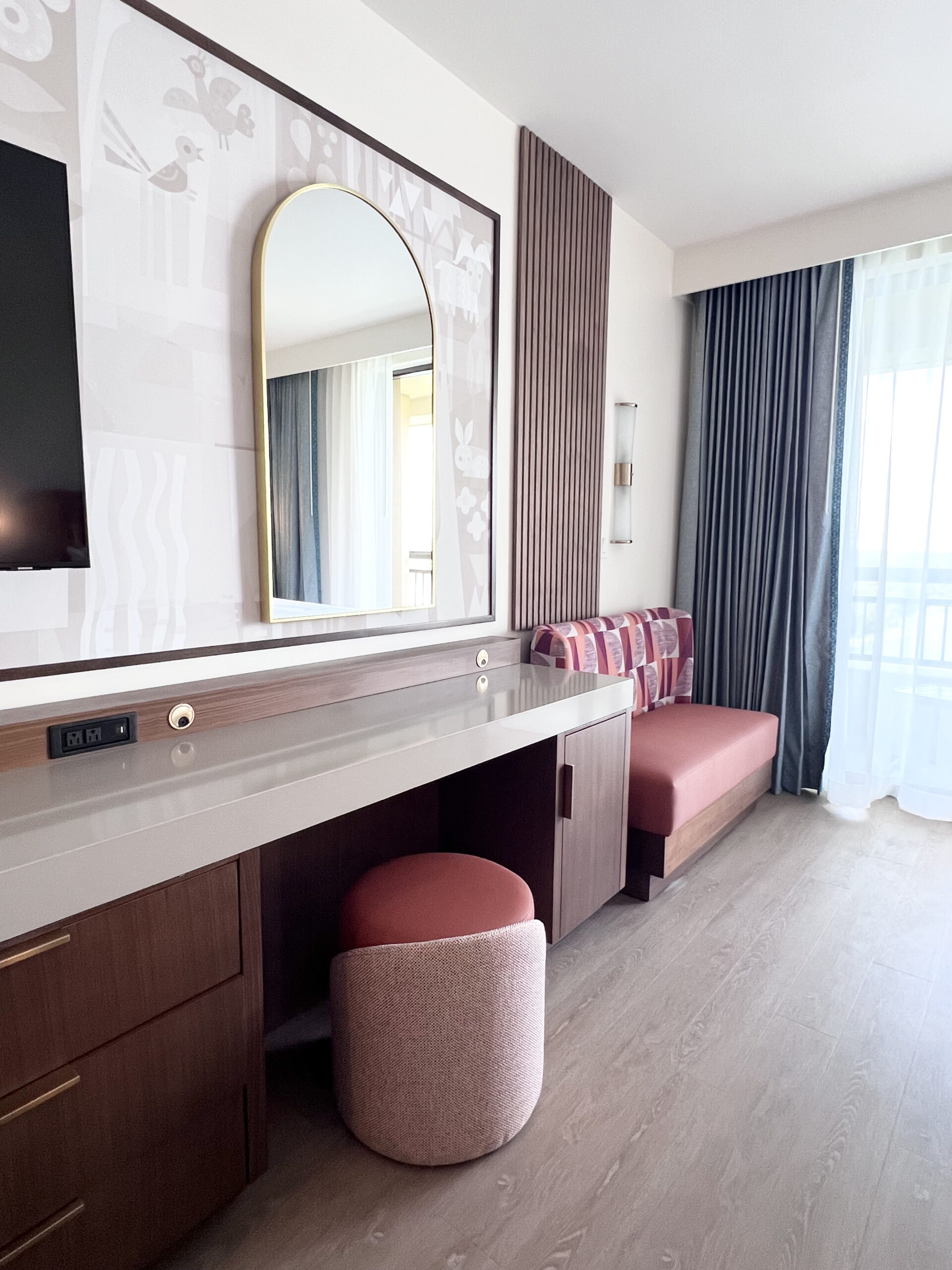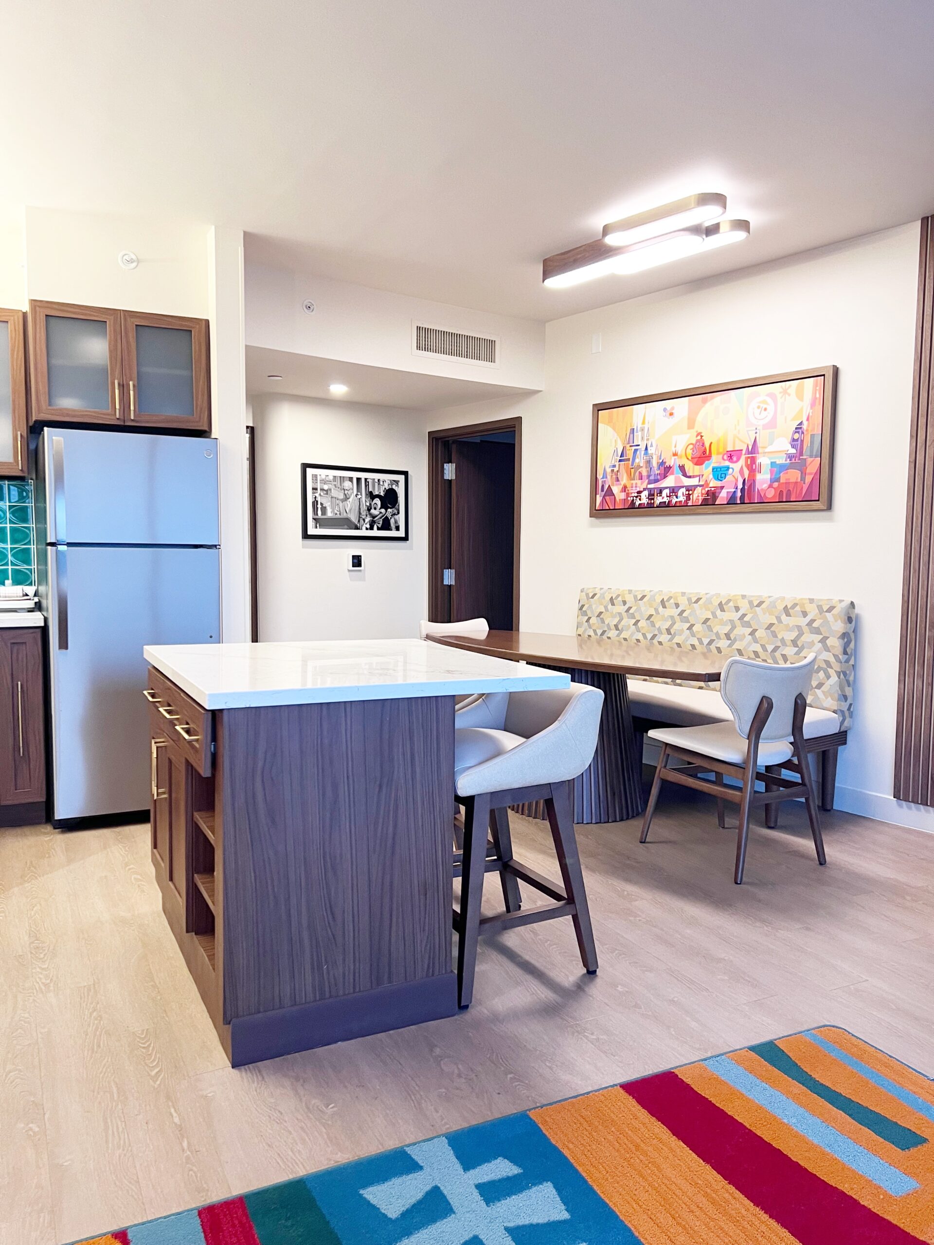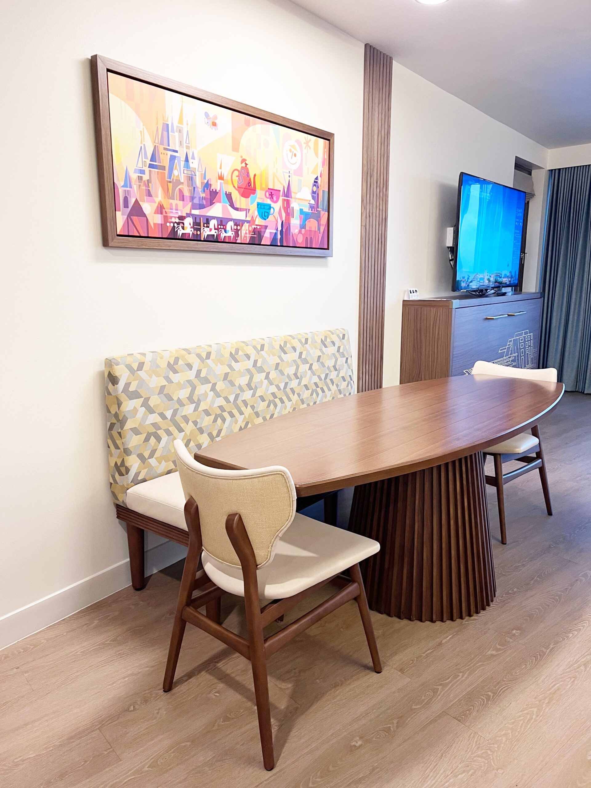 You will also find a small kitchenette area and a bathroom that feels larger than a standard hotel room. After the renovation, the rooms feel brighter, cleaner, and more modern while still honoring the Contemporary’s iconic design roots. The look has a subtle retro vibe with warm tones, clean lines, and playful Disney artwork that reminds you exactly where you are.