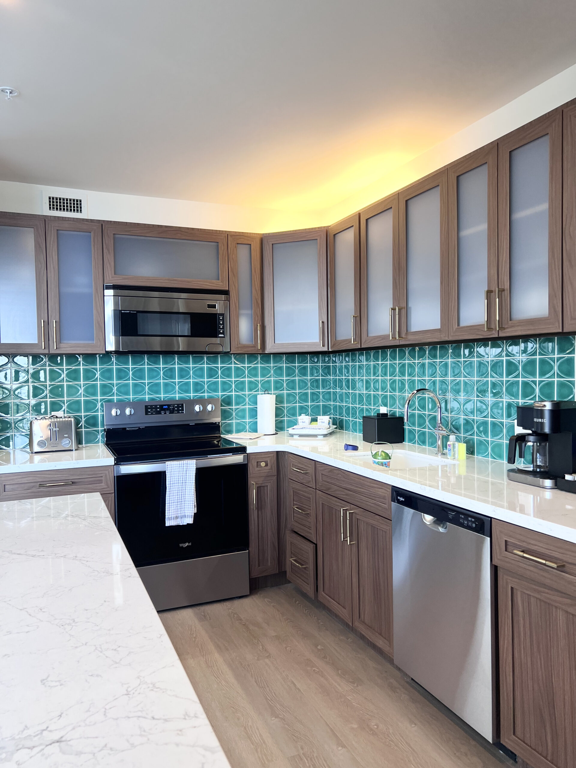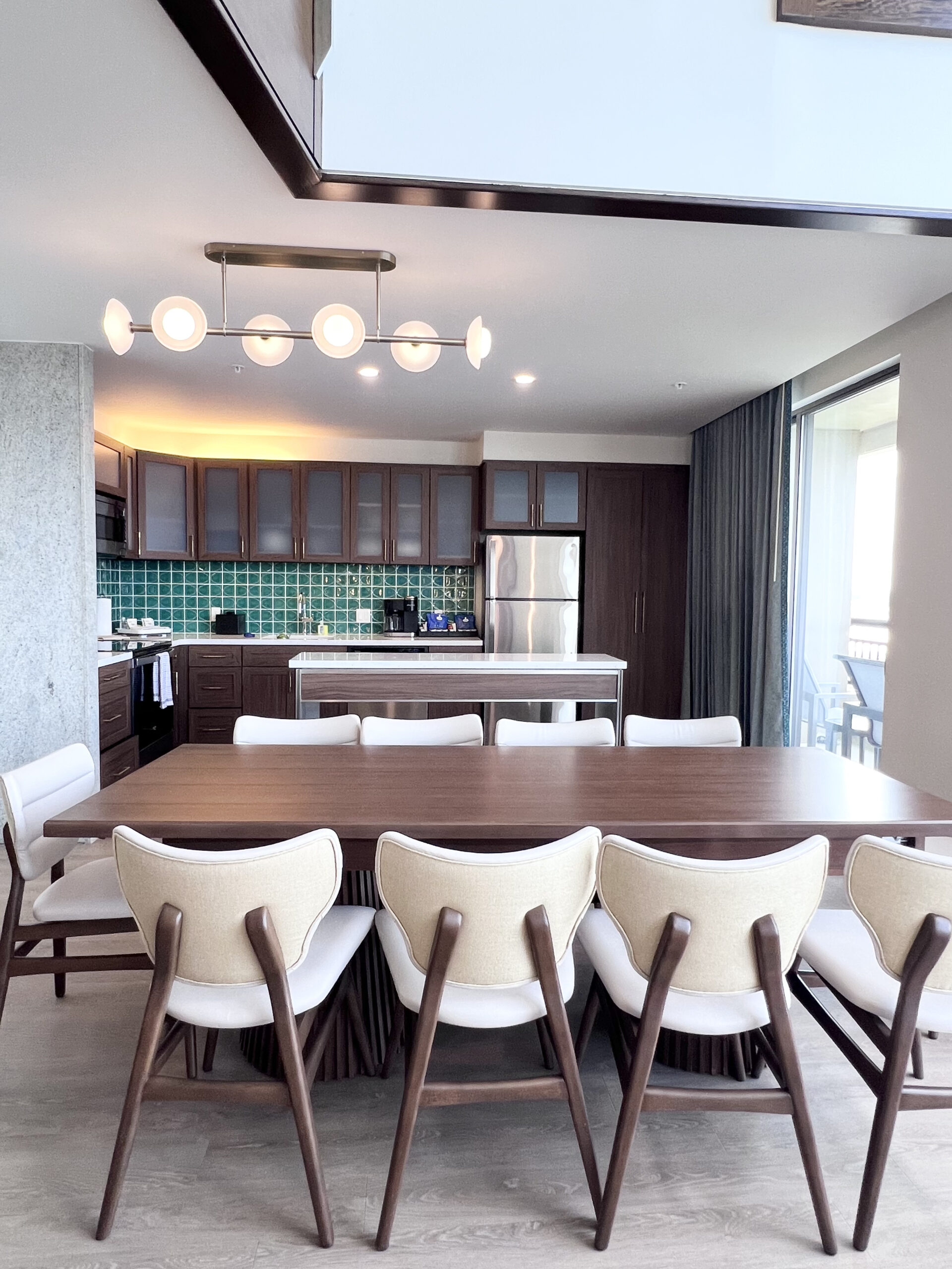 The sweeping windows in the two-story living room deliver breathtaking views of Magic Kingdom, the fireworks, Seven Seas Lagoon, and surrounding resorts on the park side, and tranquil Bay Lake views on the opposite side. The living room features a sleeper sofa and opens to a fully stocked kitchen with seating for ten. One of the villa’s four balconies is located off the kitchen, and I always recommend arranging grocery delivery when staying in a villa.