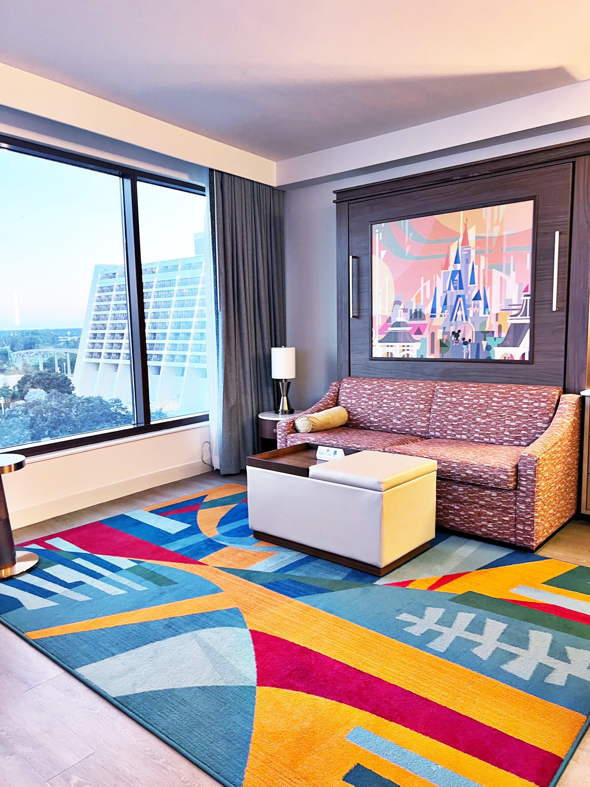 My family has always loved Deluxe Studio accommodations across Walt Disney World, and Bay Lake Tower is no exception. Studios offer a queen bed and a sleeper sofa, which helps free up floor space during the day. Many also include a fifth sleeper, which is always a welcome bonus so kids do not have to share.