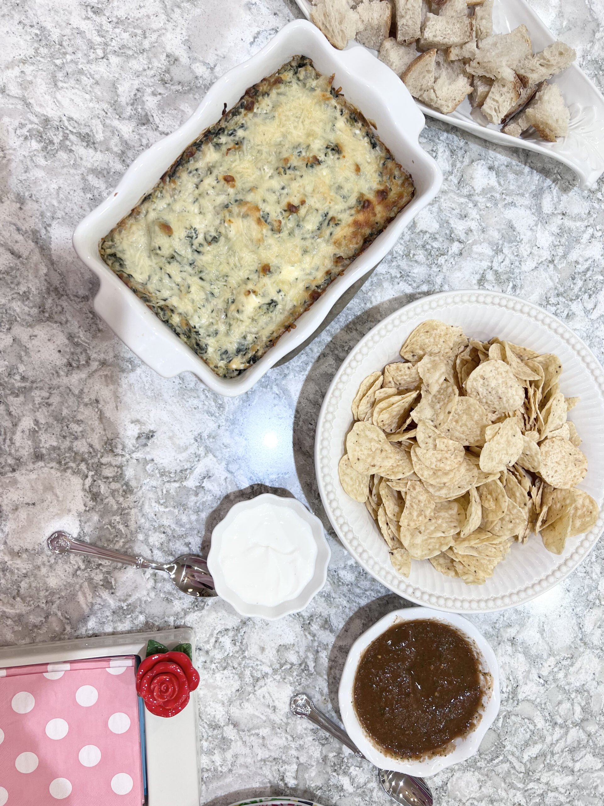 To keep things simple on the food front, I made a batch of my favorite spinach dip and Honey made his salsa. Easy, cozy and perfect for grazing.