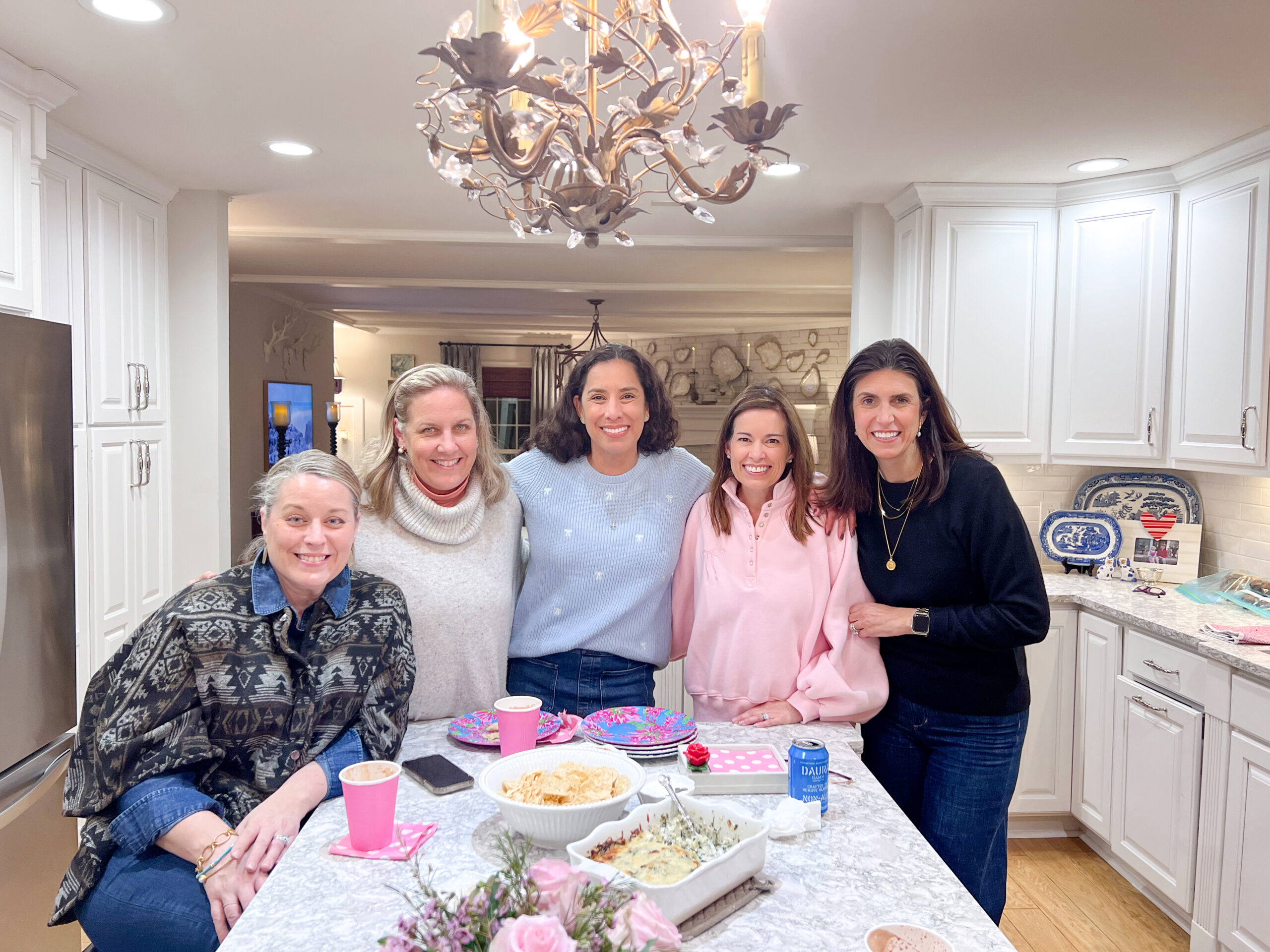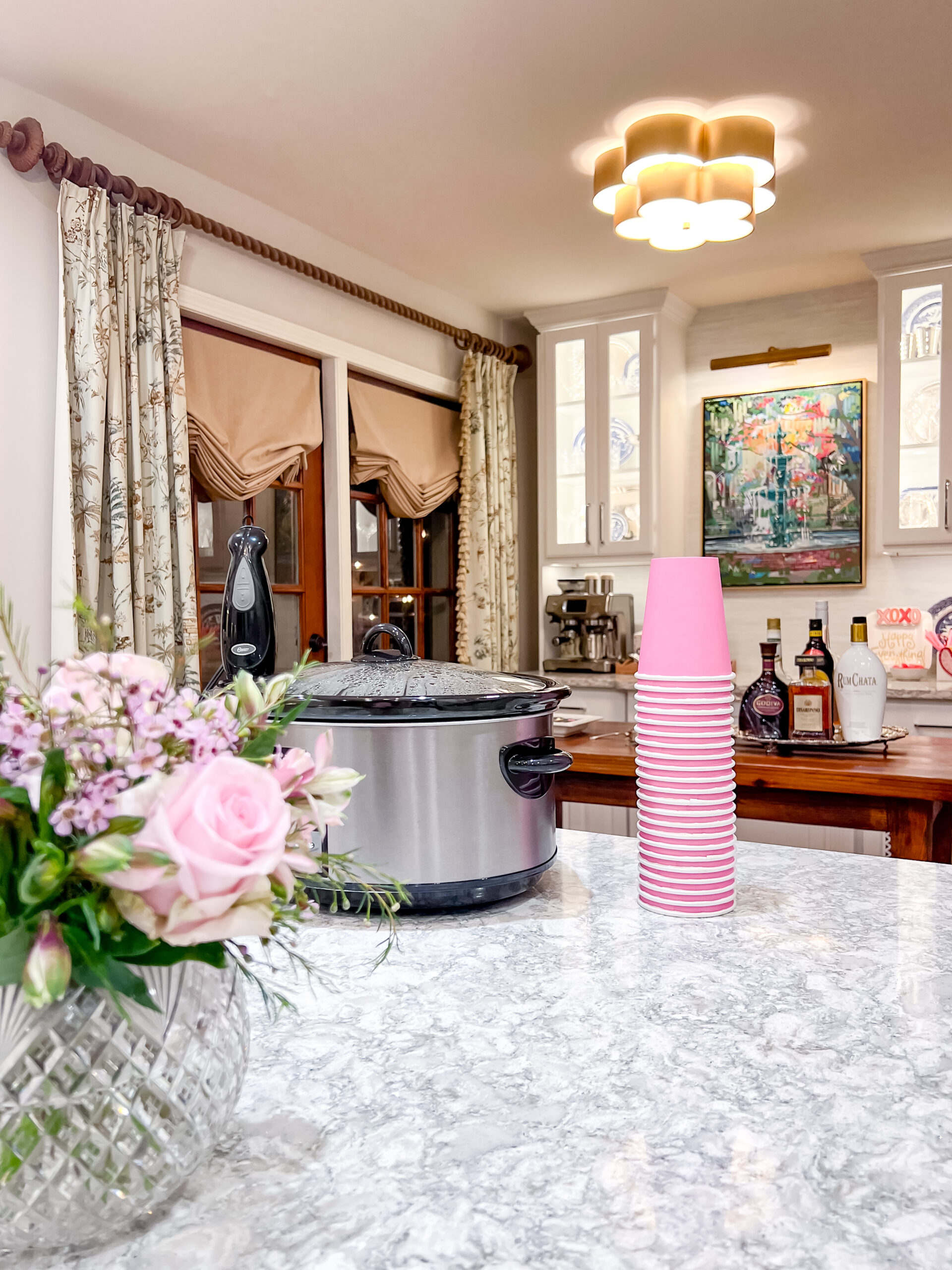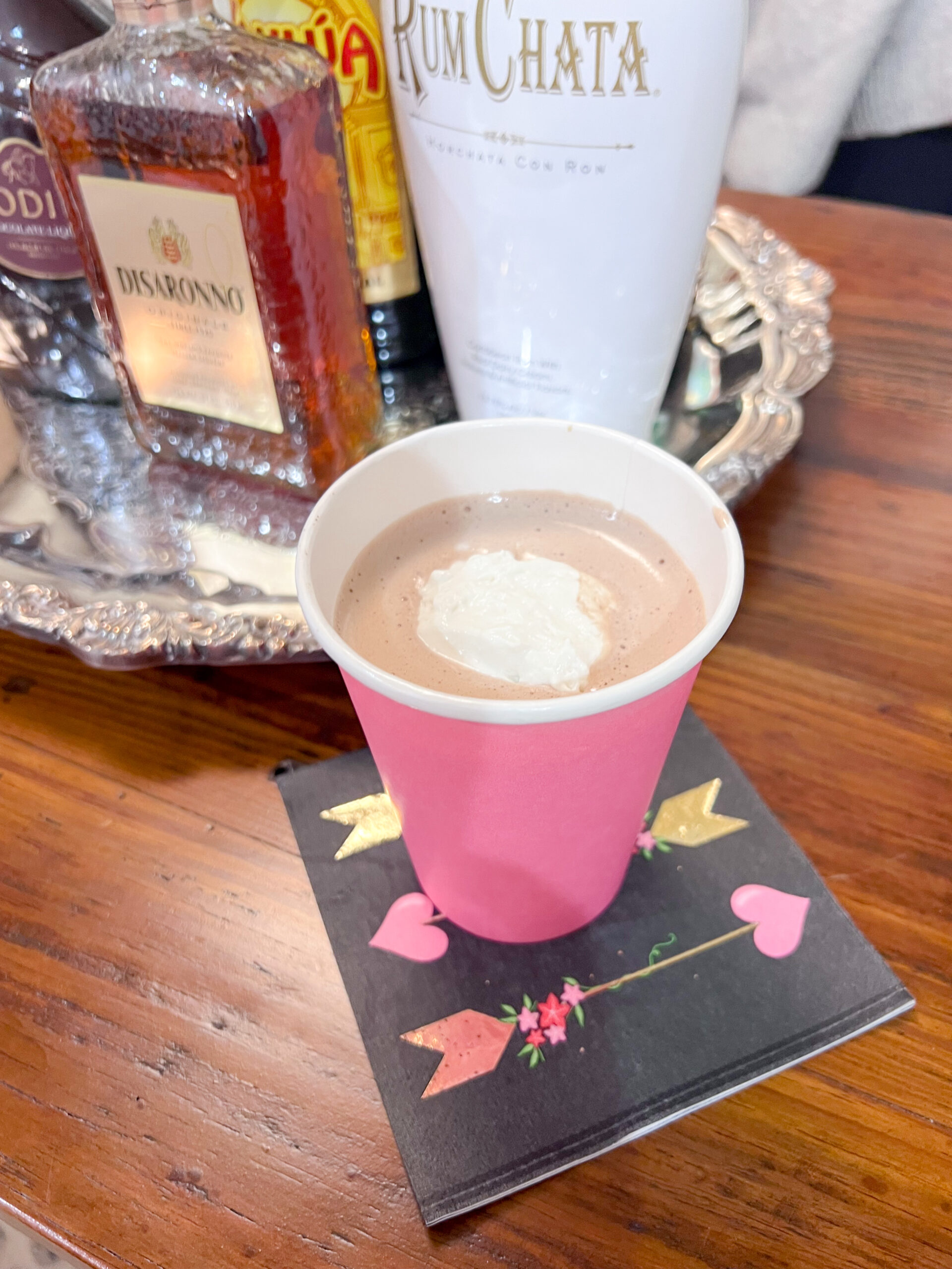 Hot cocoa was the star of the night. I used this homemade hot chocolate recipe (linked here), which we’ve been obsessed with since I first made it last January. For this crowd, I tripled the recipe, made it on the stove, then transferred everything to the crock pot so it stayed warm all evening. I also made a big batch of homemade whipped cream and dug up some pink disposable coffee cups from my stash (last used for an elementary school Valentine’s party), along with a few cute Valentine’s napkins that fit the cozy vibe perfectly. If you read the linked recipe, you’ll see that we usually whip it in our milk frother. To keep things easy and self serve, I put out my immersion blender.