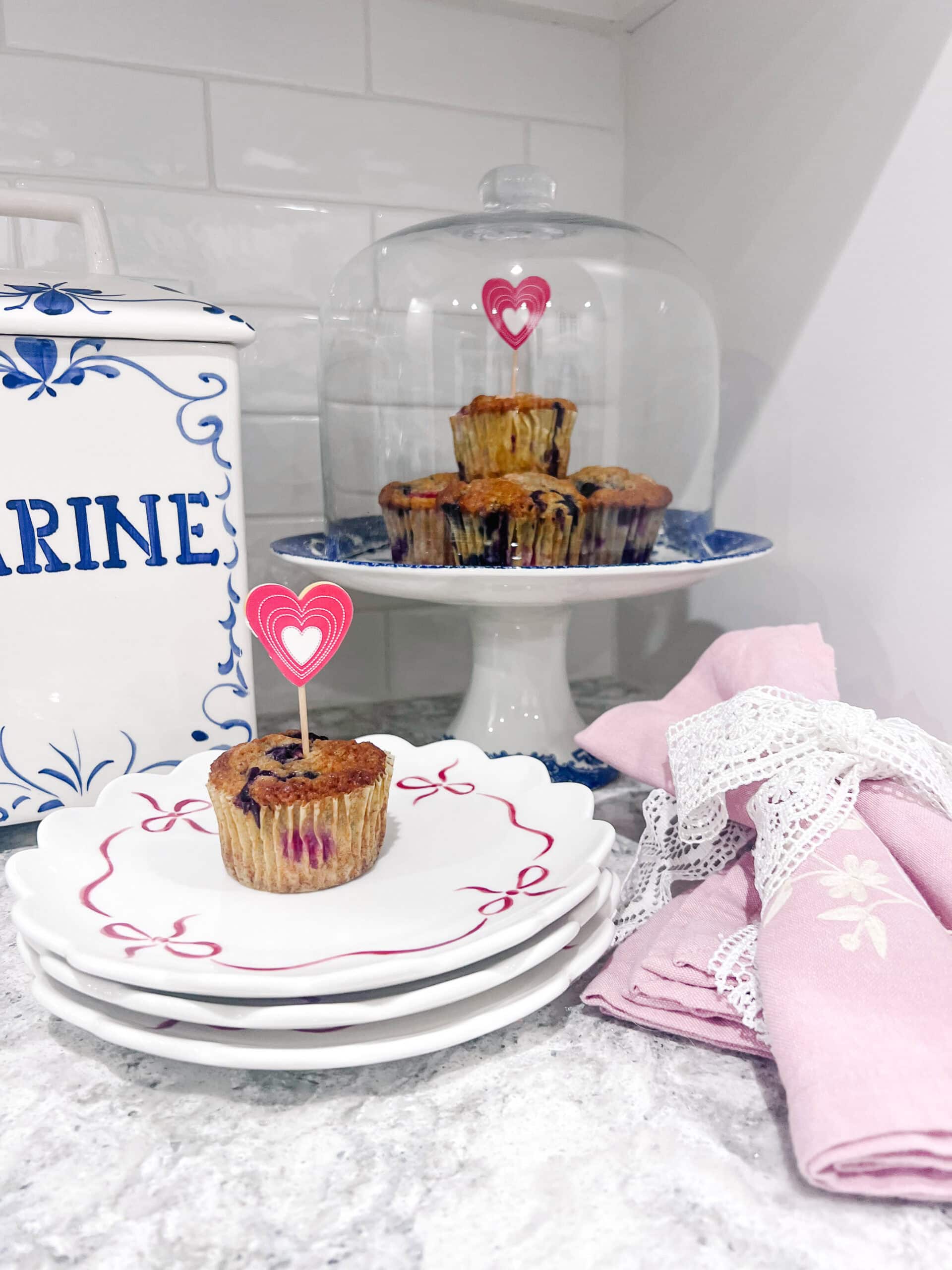 Tri-berry muffins are a sweet addition. The bow plates are a couple of years old from Mark & Graham. The pink napkins were a wedding shower gift!