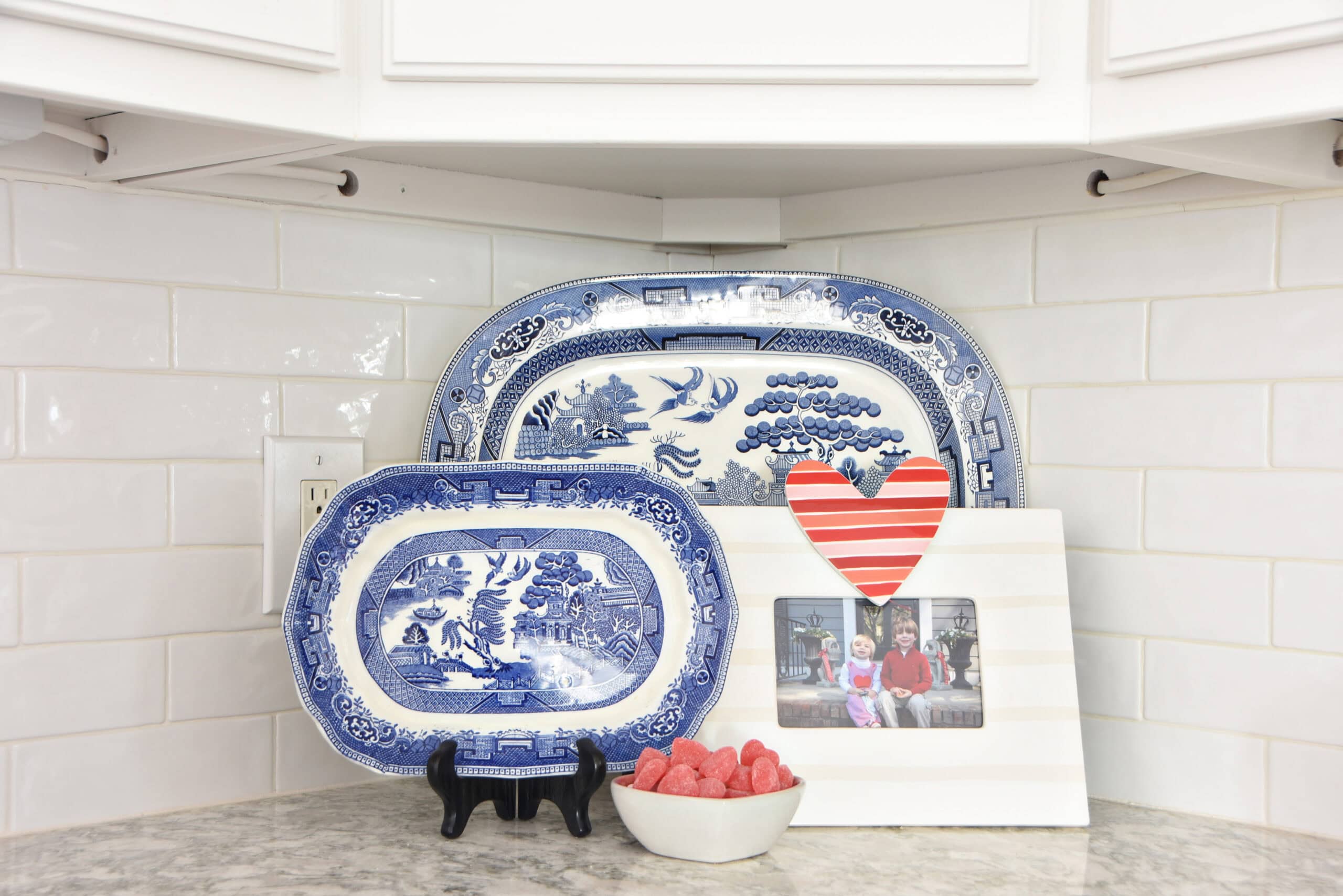 A couple of decorative hand towels hang from the oven, and rather than hiding cute dishes in a cabinet, I love pulling a few out and stacking them on the counter.
