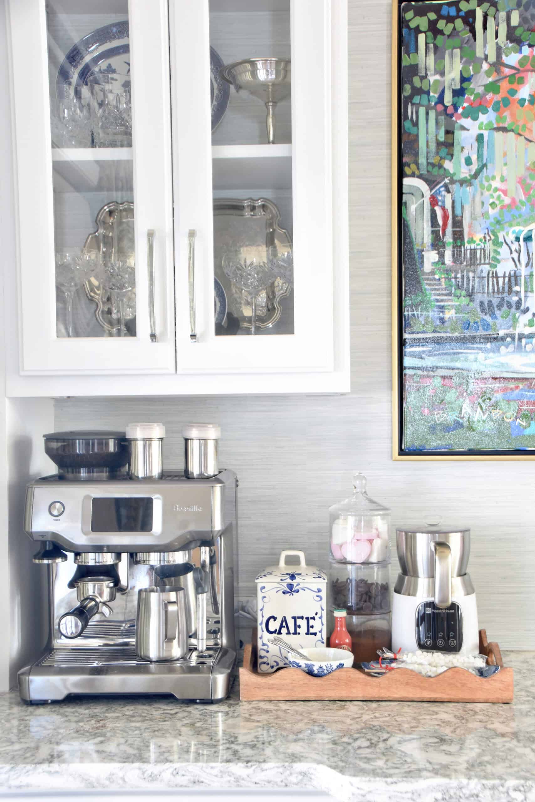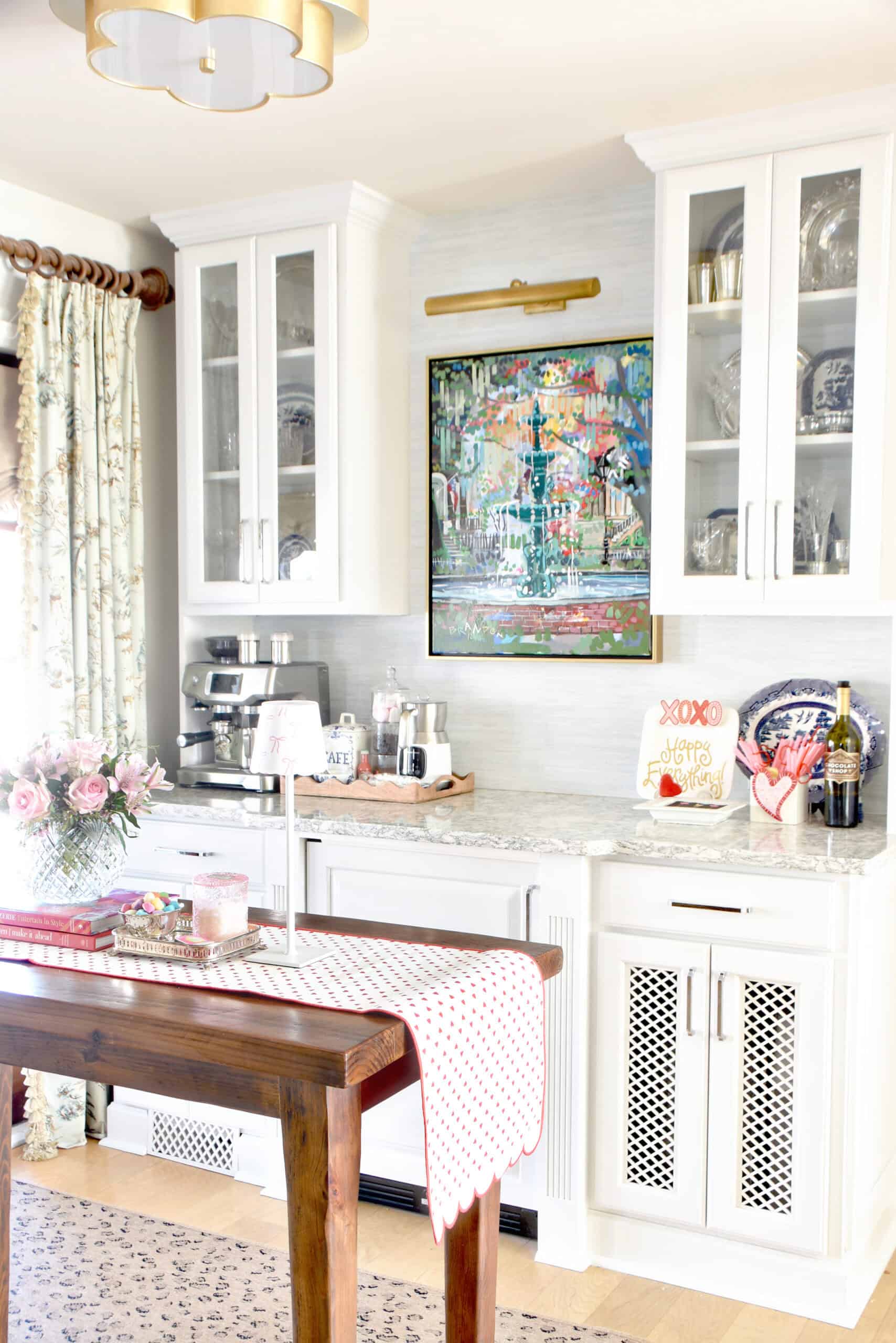 The coffee bar serves hot coffee in the morning, hot tea in the afternoon, and hot chocolate by evening. It was a lot of fun to dress it up with all the cute Valentine’s things. The heart shaped marshmallows are from Target.