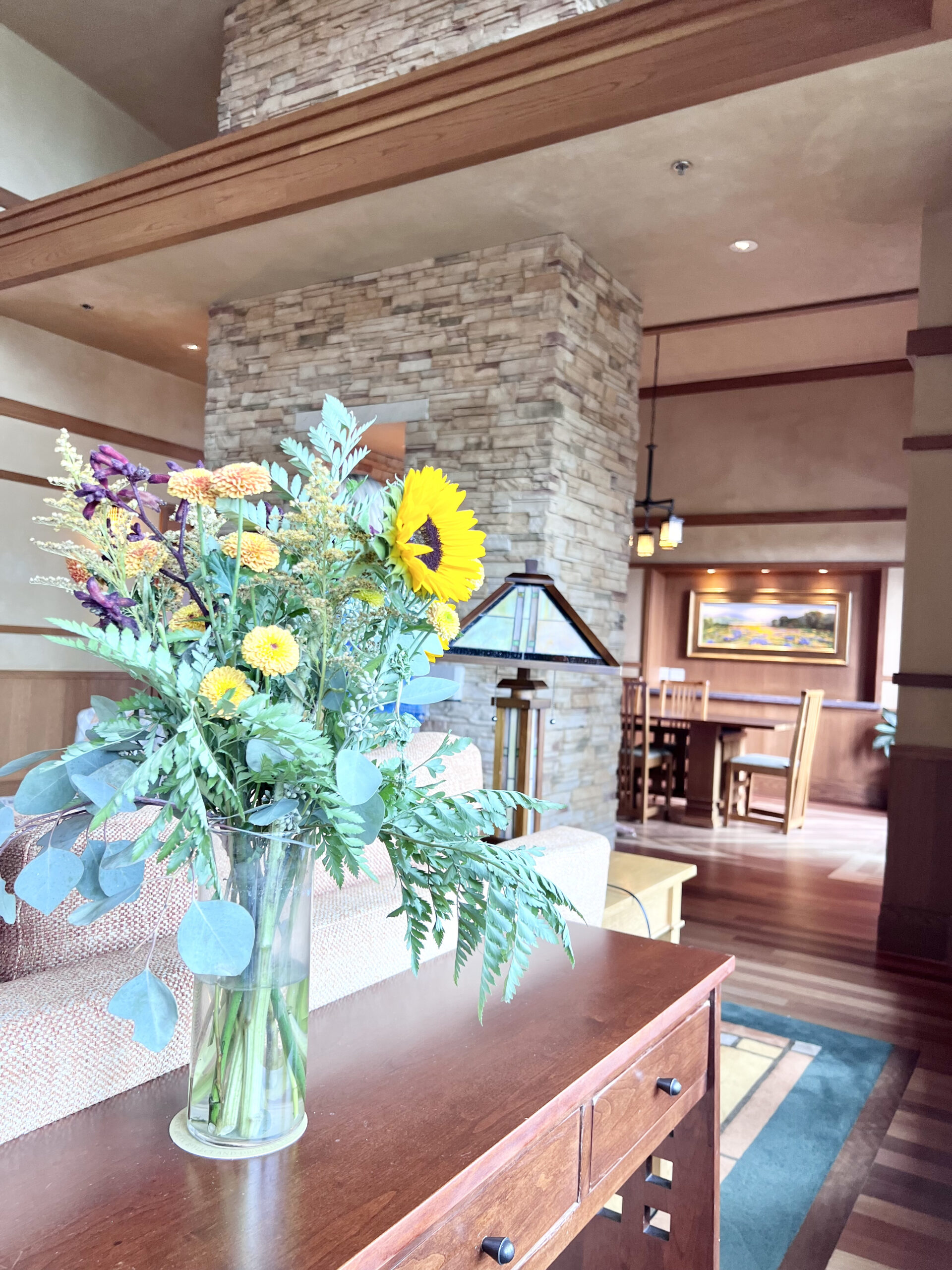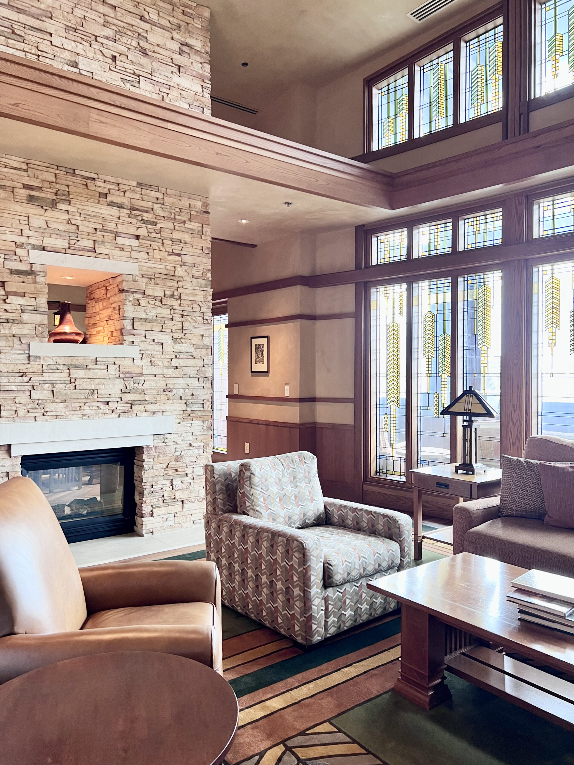 One of my favorite spots is the heated porch just off the lobby, where rocking chairs sit around a massive stone fireplace. It is the perfect place to unwind after a busy day in the parks. Inside, a second fireplace in the lobby is another popular gathering place for relaxing with a cocktail.