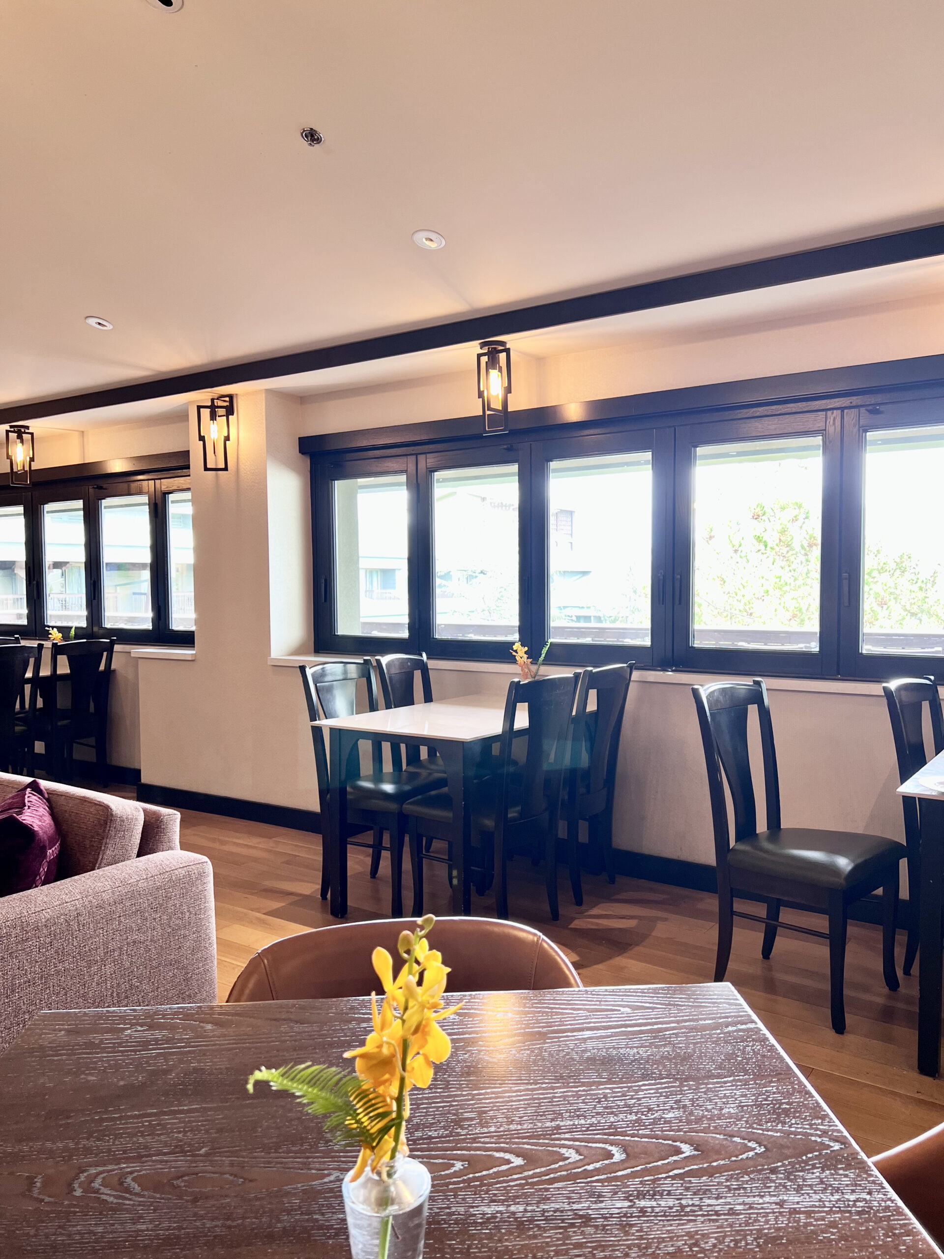 One of the standout features is the long balcony overlooking the monorail courtyard. It is a beautiful place to enjoy a morning coffee, an afternoon snack, or watch the fireworks in the evening.