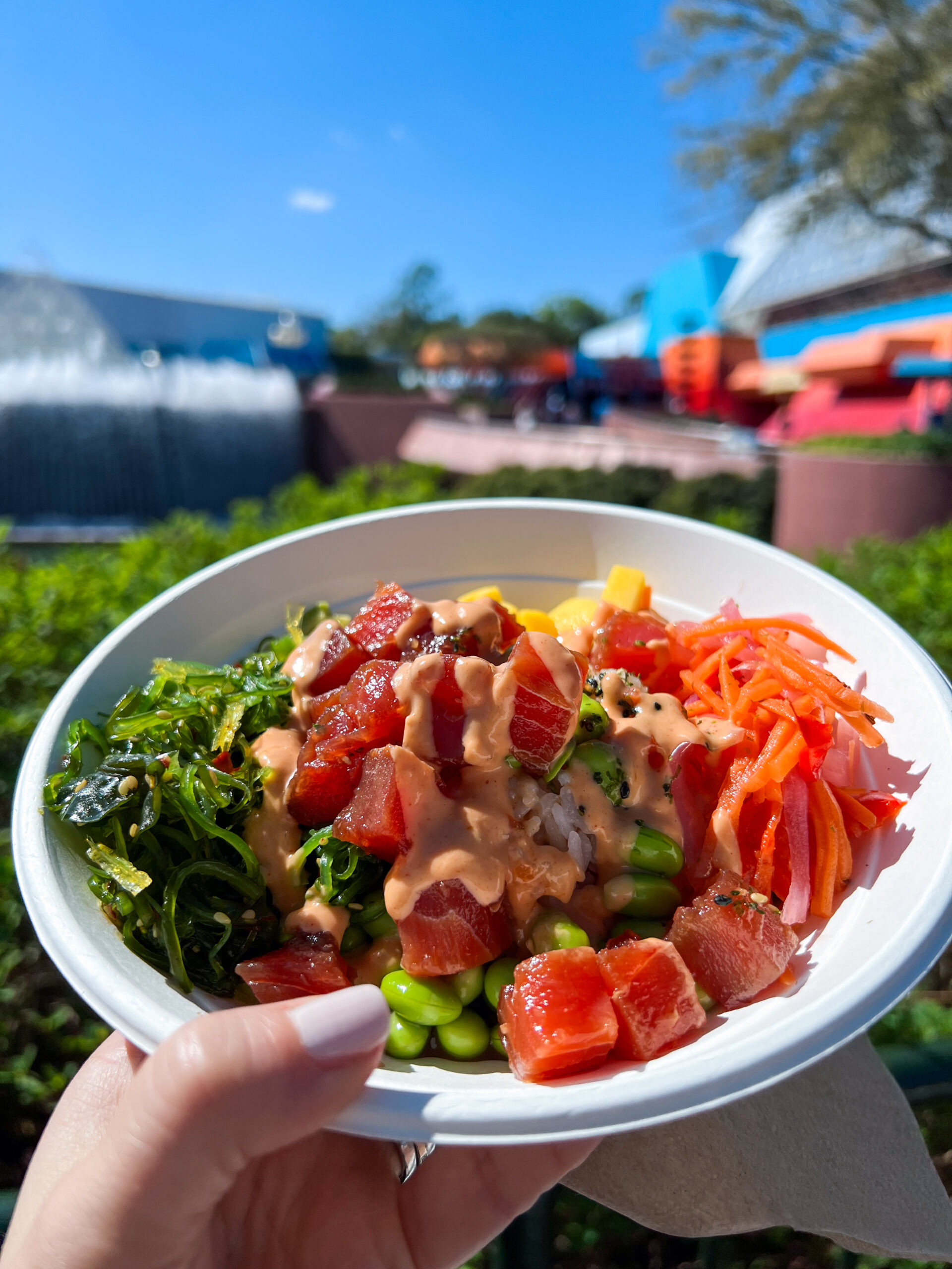 Tuna Poke Bowl with edamame, avocado, mango, pickled red onions, seaweed salad, furikake, and umami sauce on a bed of sticky rice