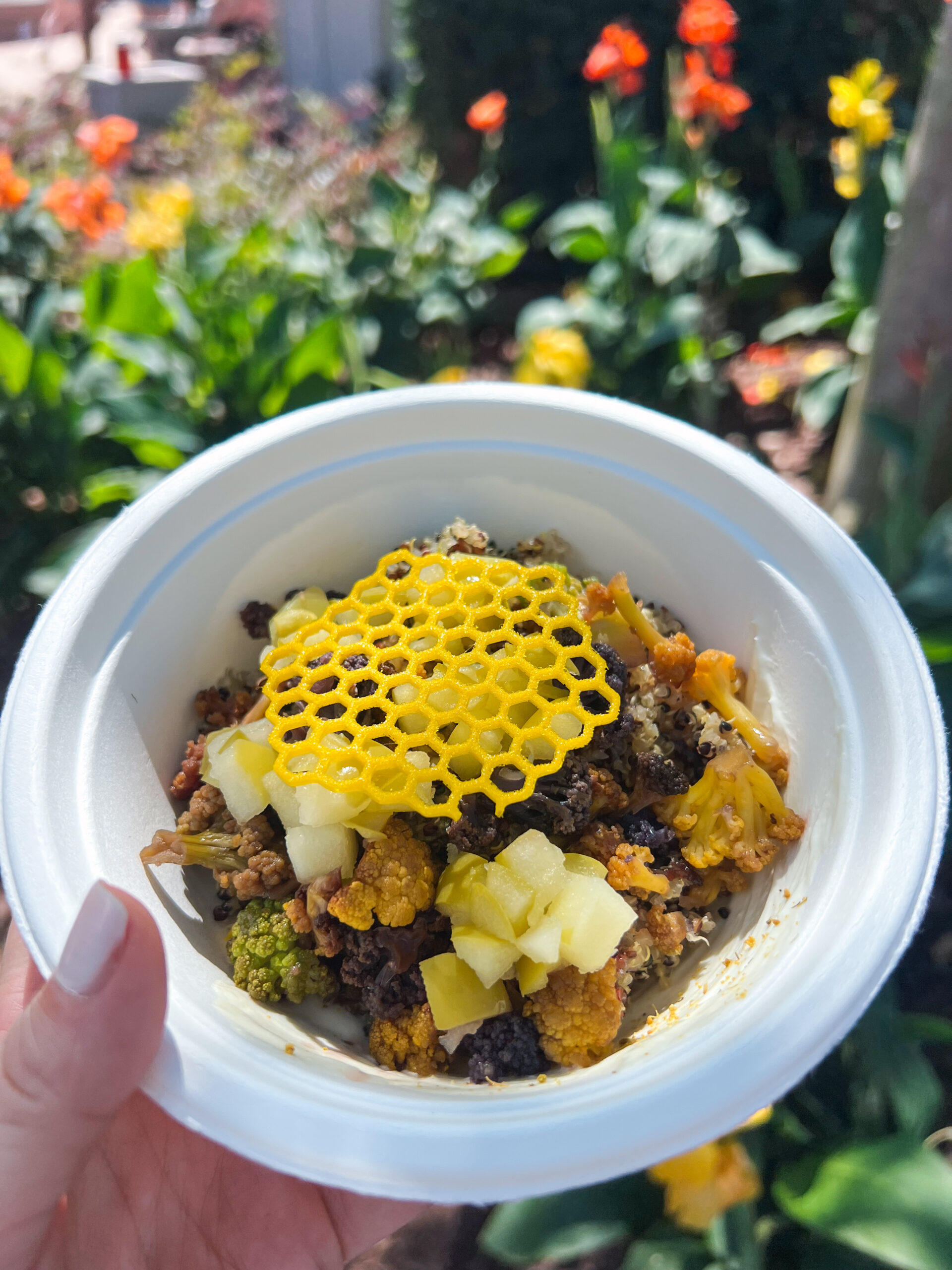Honeycomb Bowl with herb quinoa, honey-whipped goat cheese, poached apples, and hot honey cauliflower topped with a honey tuile (this one was OK)