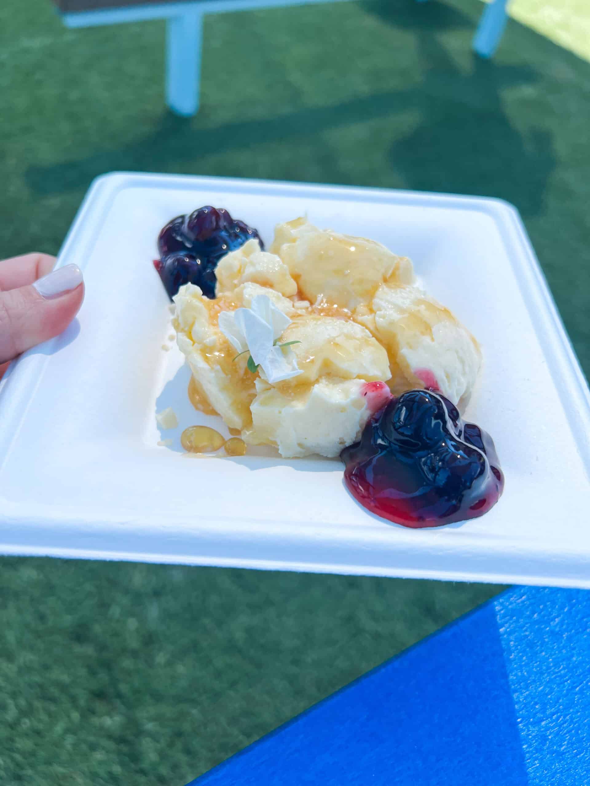 Liquid Nitrogen Honey-Mascarpone Cheesecake with fresh honey, granulated honey, and honey mead-blueberry compote