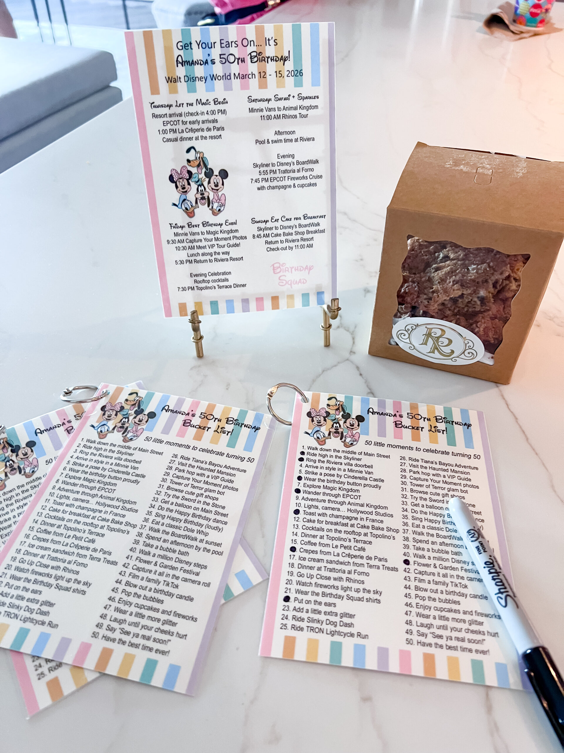I also made a birthday bucket list with 50 little moments and experiences for us to check off throughout the weekend. I printed and laminated copies for all of the ladies and added clip rings so we could attach them right onto our park bags. It was such a fun little detail and something we could all share together.