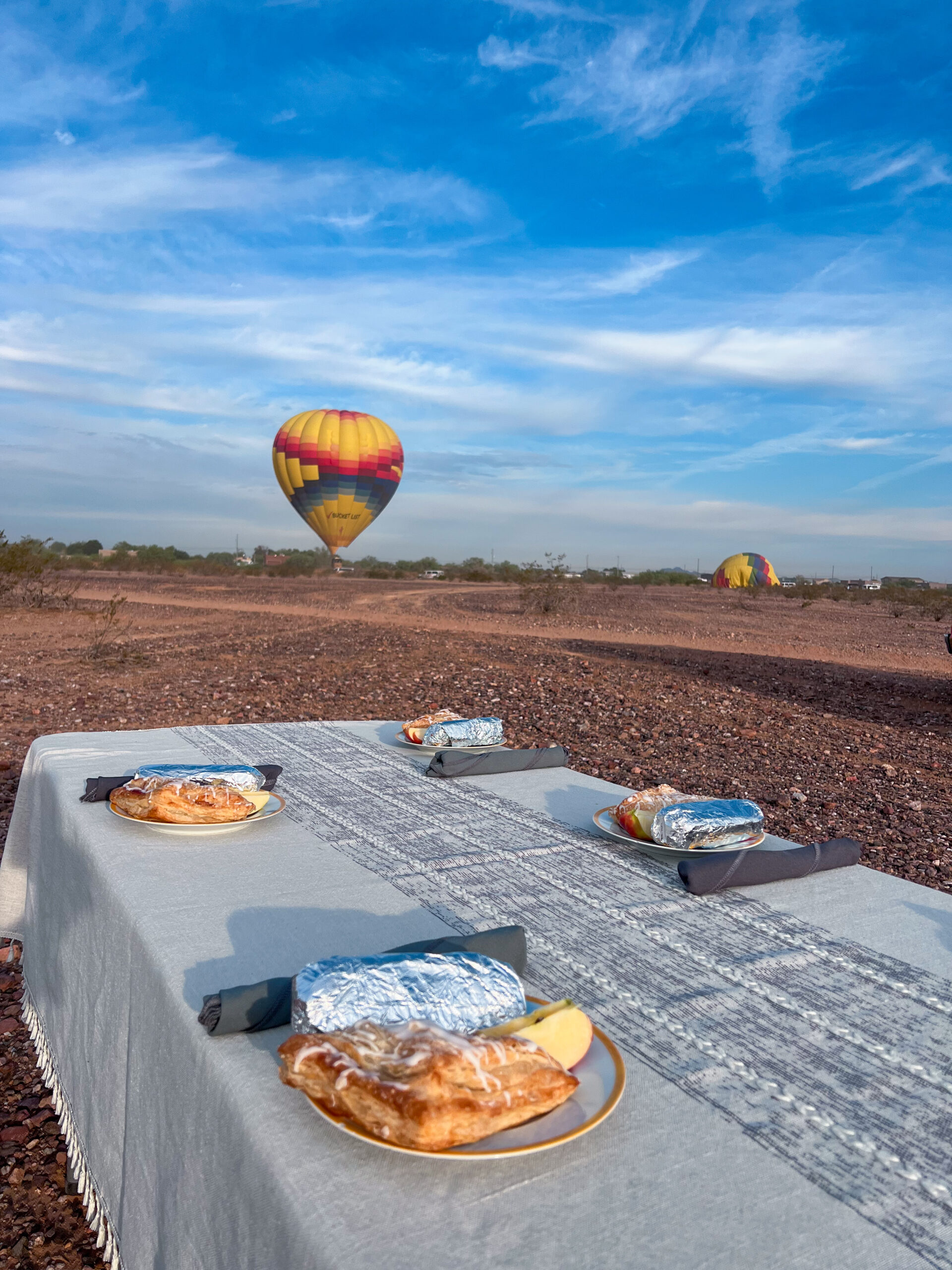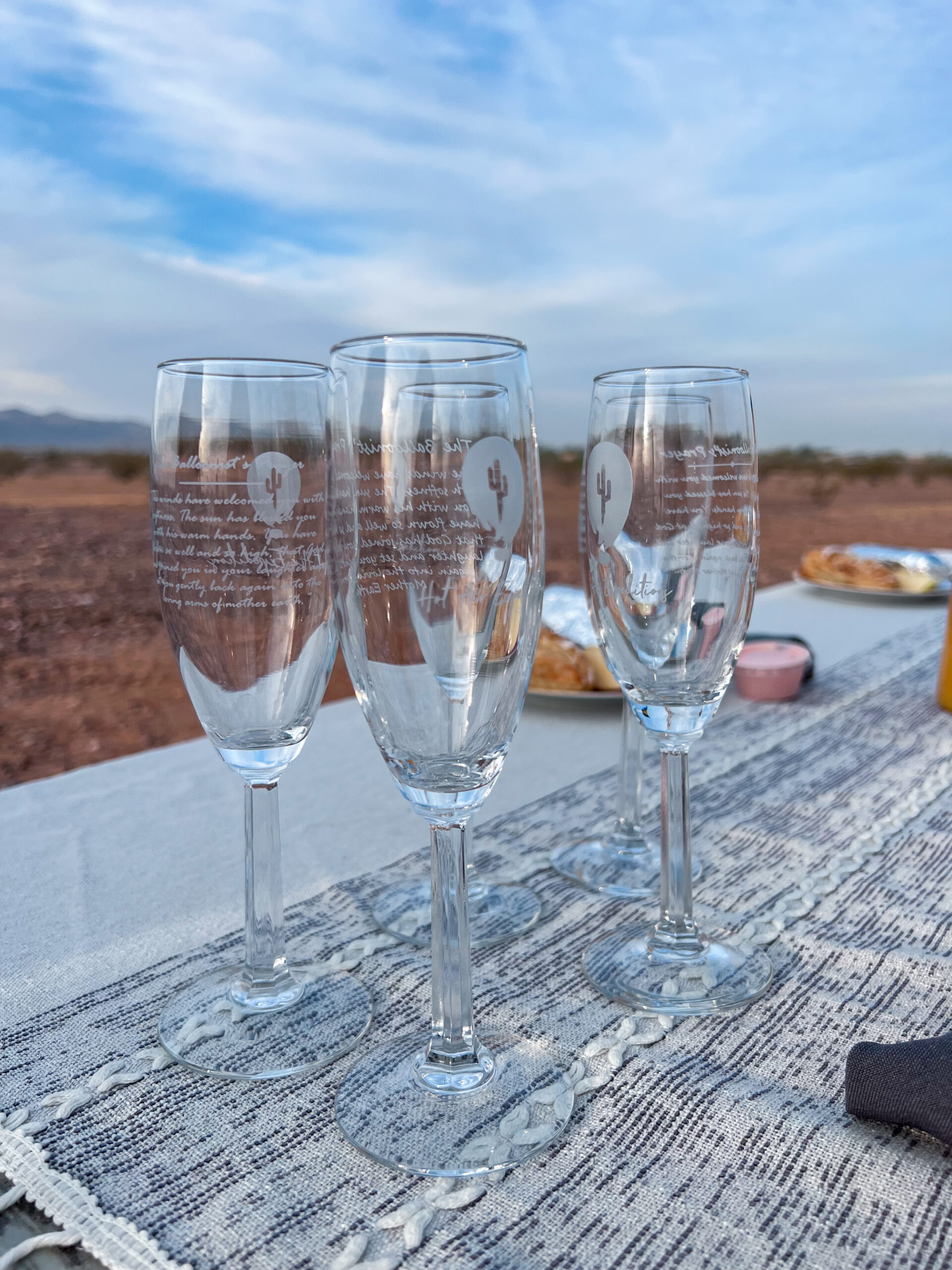 After landing, we were treated to a beautiful breakfast right there in the desert. I had the honor of popping the bubbly as she shared the traditional balloonist’s prayer: