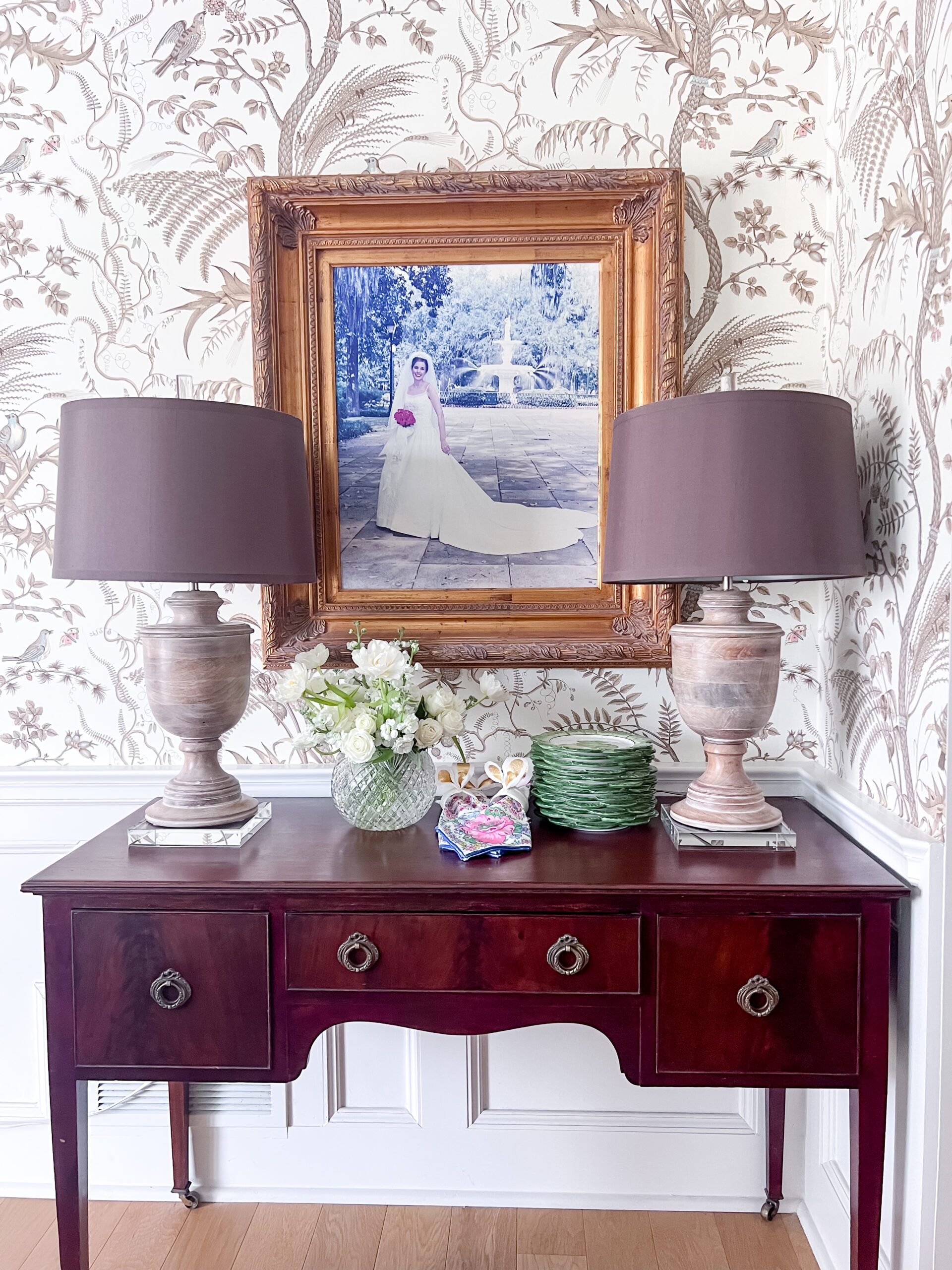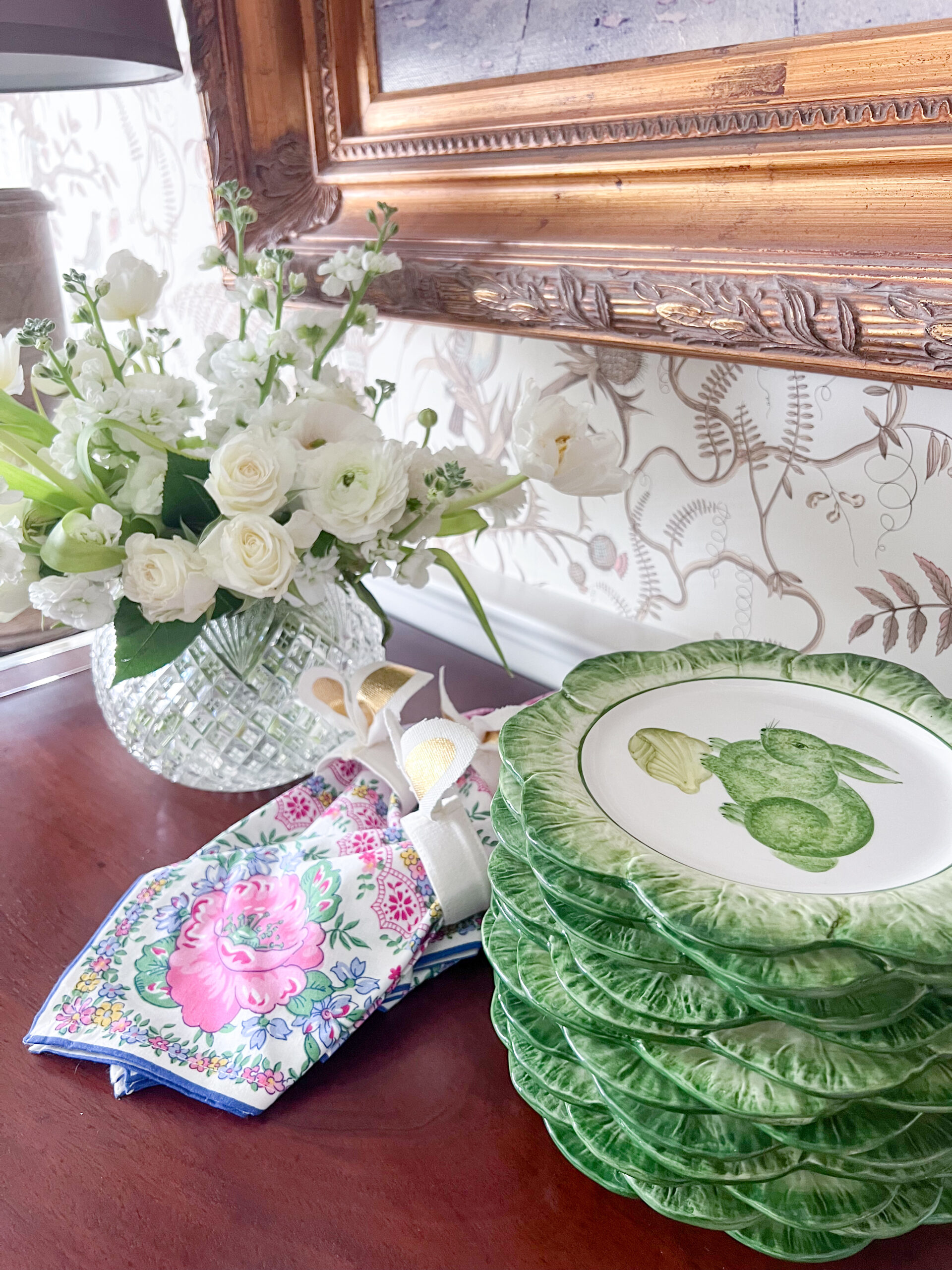 On the sideboard, I kept it simple and classic with my grandmother’s rose bowl filled with fresh spring buds, layered with napkins and bunny plates that just feel like Easter.