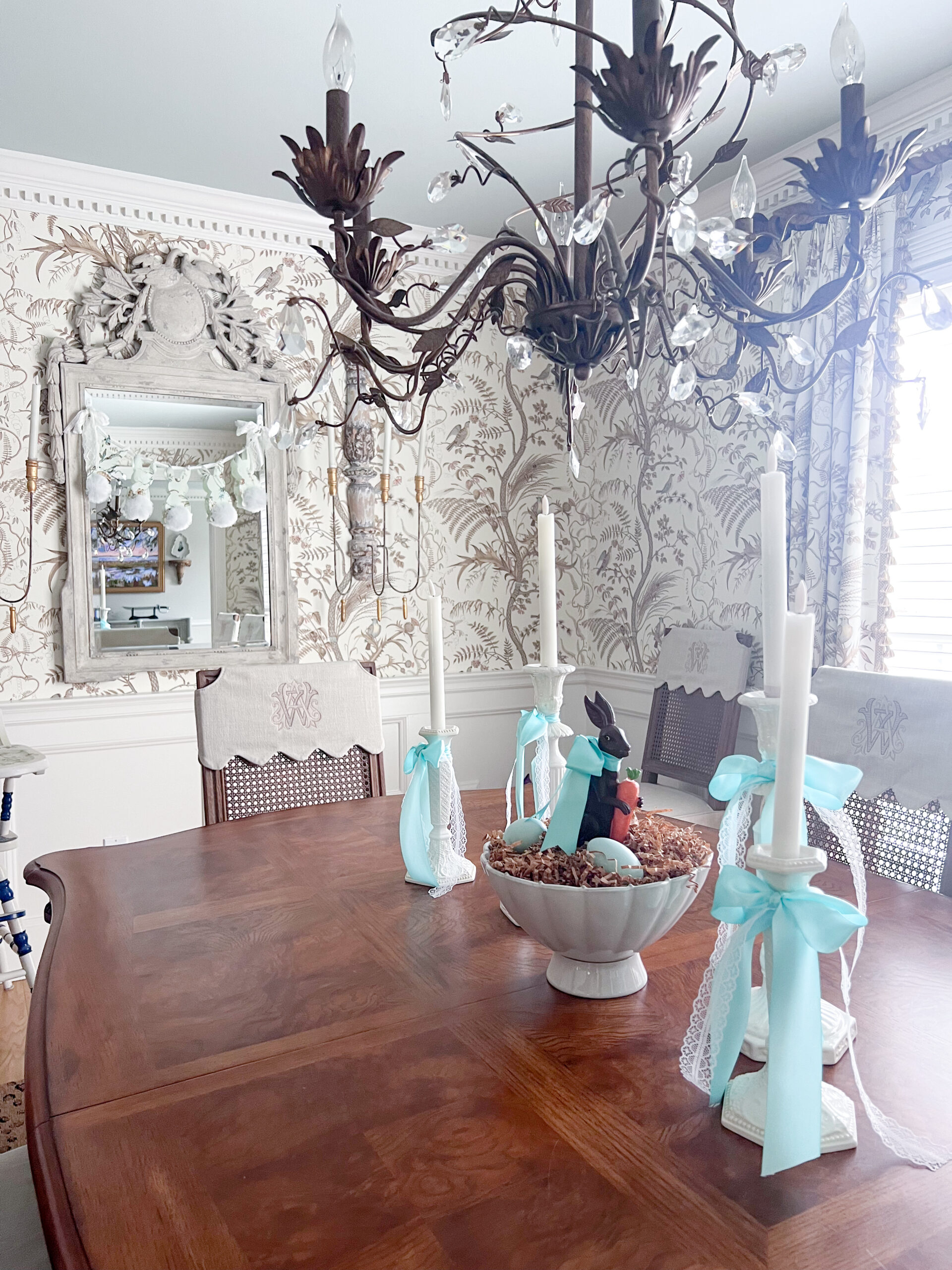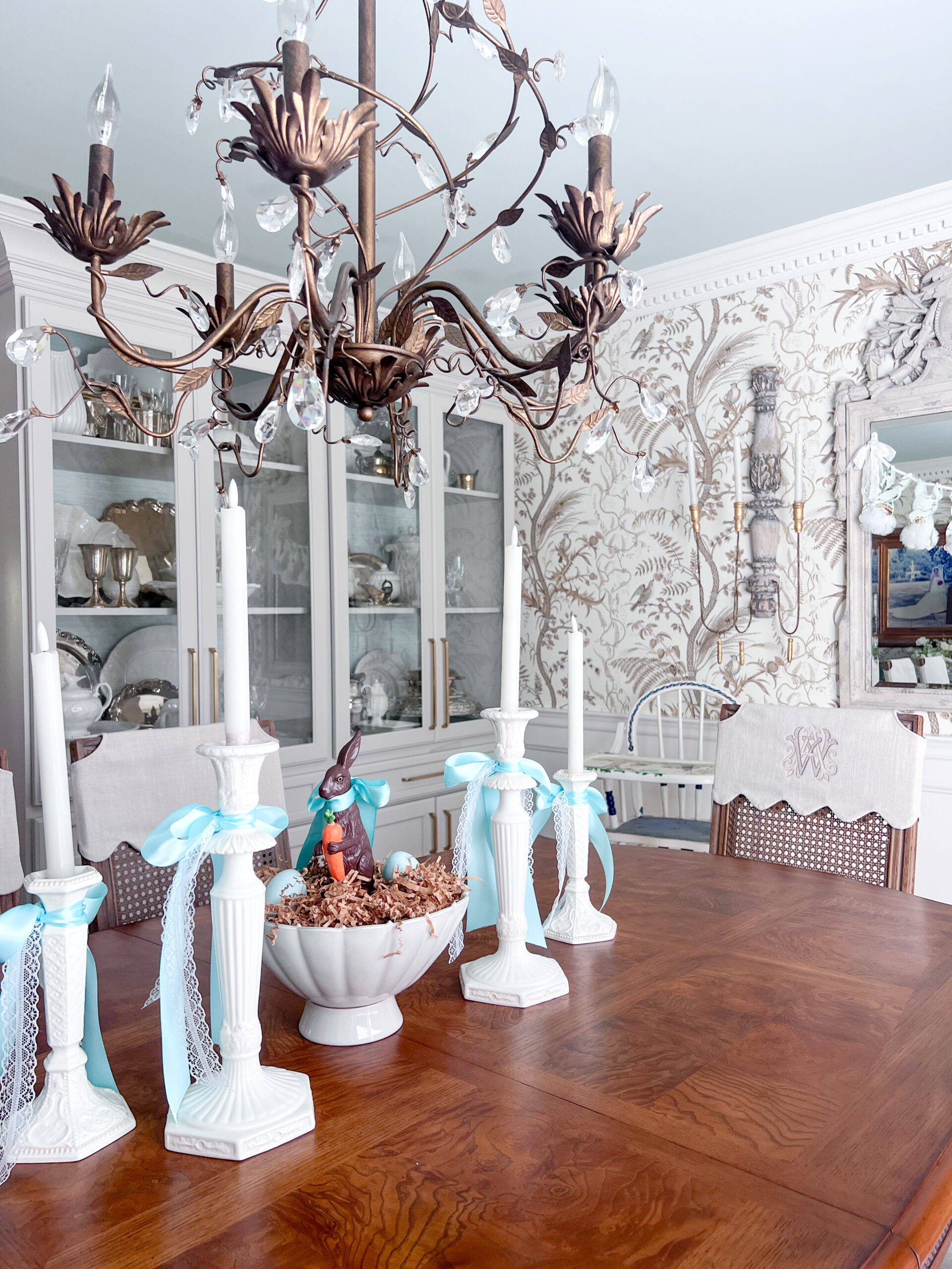 A sweet little chocolate bunny sits front and center in a pedestal bowl, which might be my favorite detail on the table. I dressed up the candlesticks with the prettiest aqua ribbon paired with a delicate lace ribbon for a soft, spring touch. Since we dine here for all of our meals, keeping the centerpiece simple just works better for everyday life.