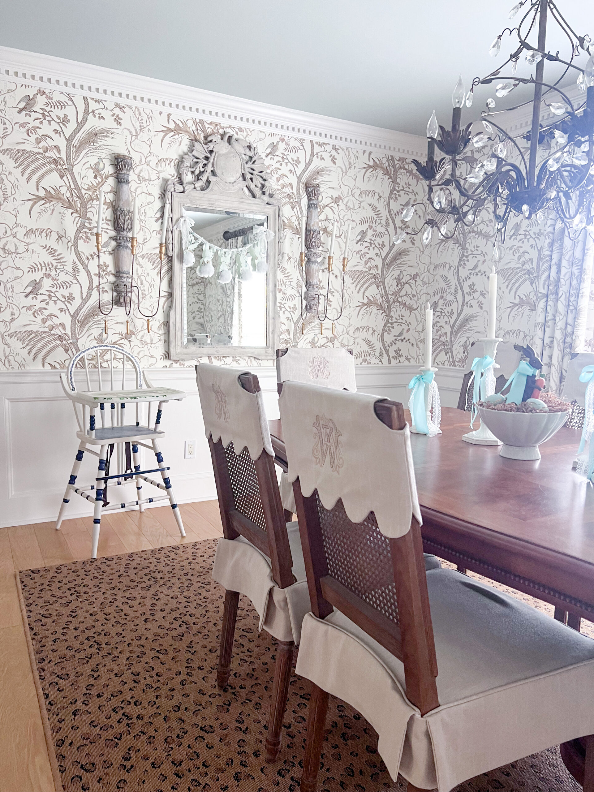For Easter in the dining room, I kept things soft, layered and just a little bit whimsical. You’ve seen most of these pieces before, used in different spaces over the years. There’s something about using what you already have, especially when it’s made up of things you truly love.