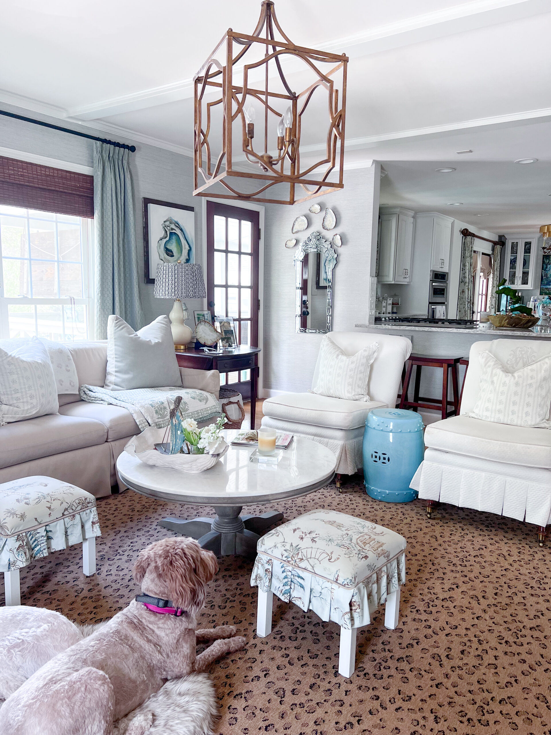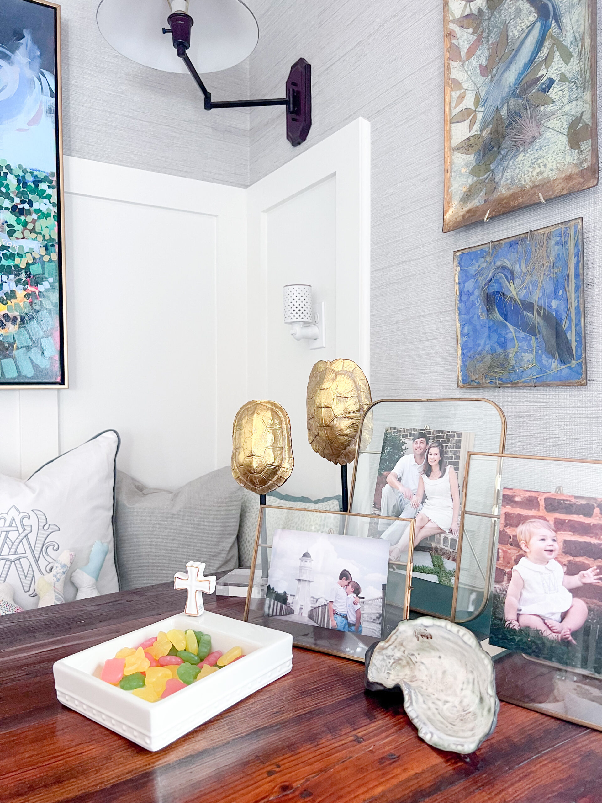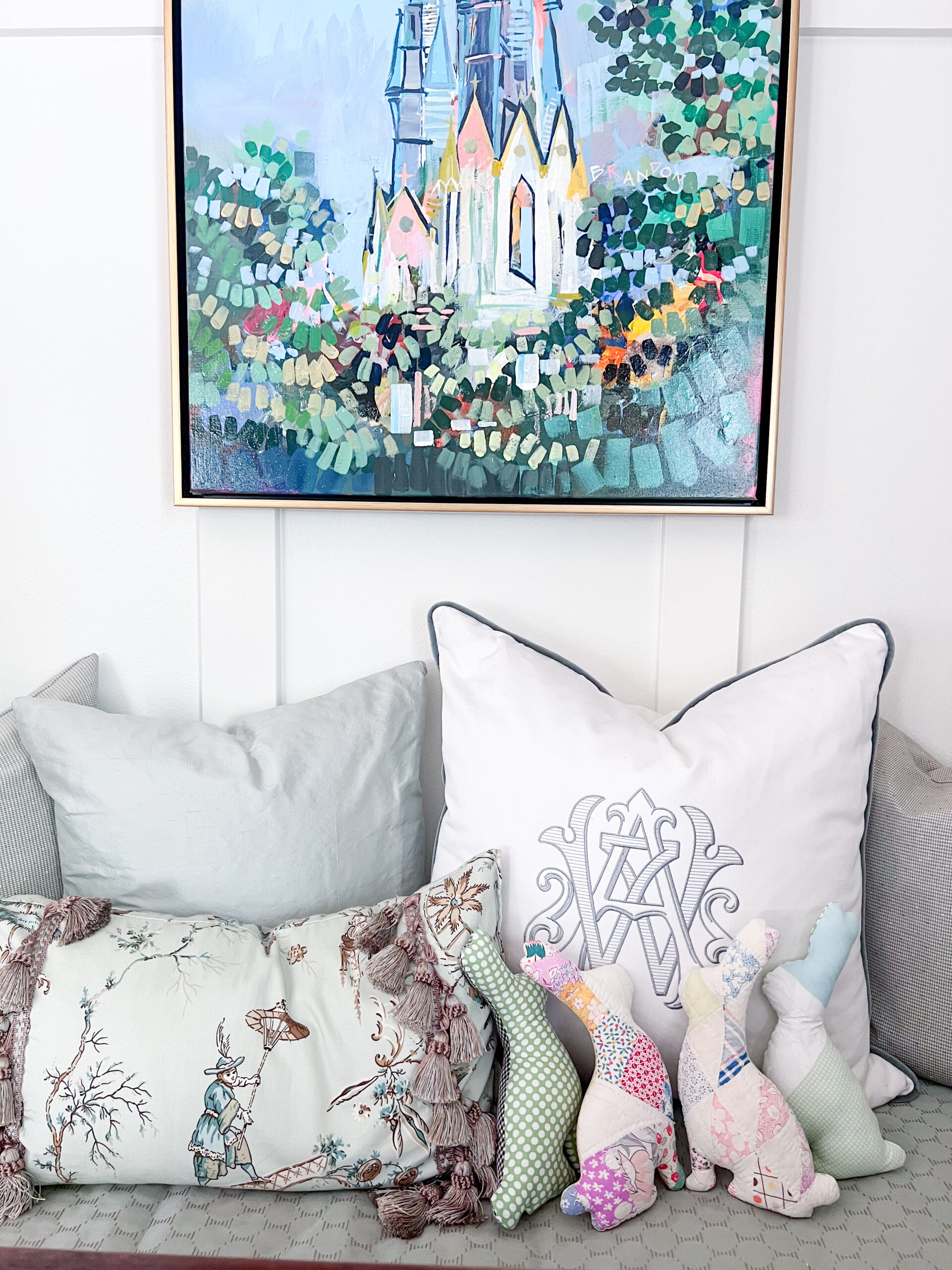 Over on the banquette, I added a Nora Fleming napkin dish filled with spring gummies, just a small, easy detail that feels festive without trying too hard. And my “Easter at the White House” puzzle made its way into the living room this year. I especially love this one because it brings back such sweet memories of the Easter we spent in DC.