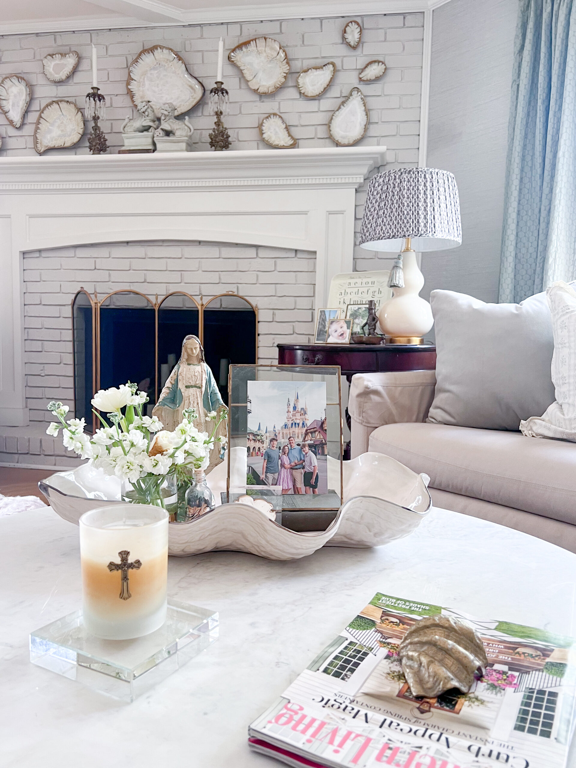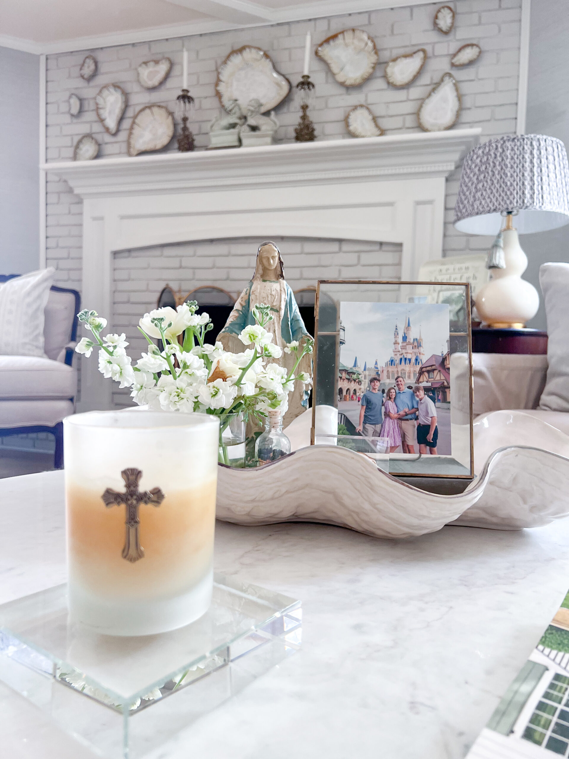 The coffee table is one spot I always change seasonally. This year, I kept it simple with my statue of Mary and a few spring flowers.