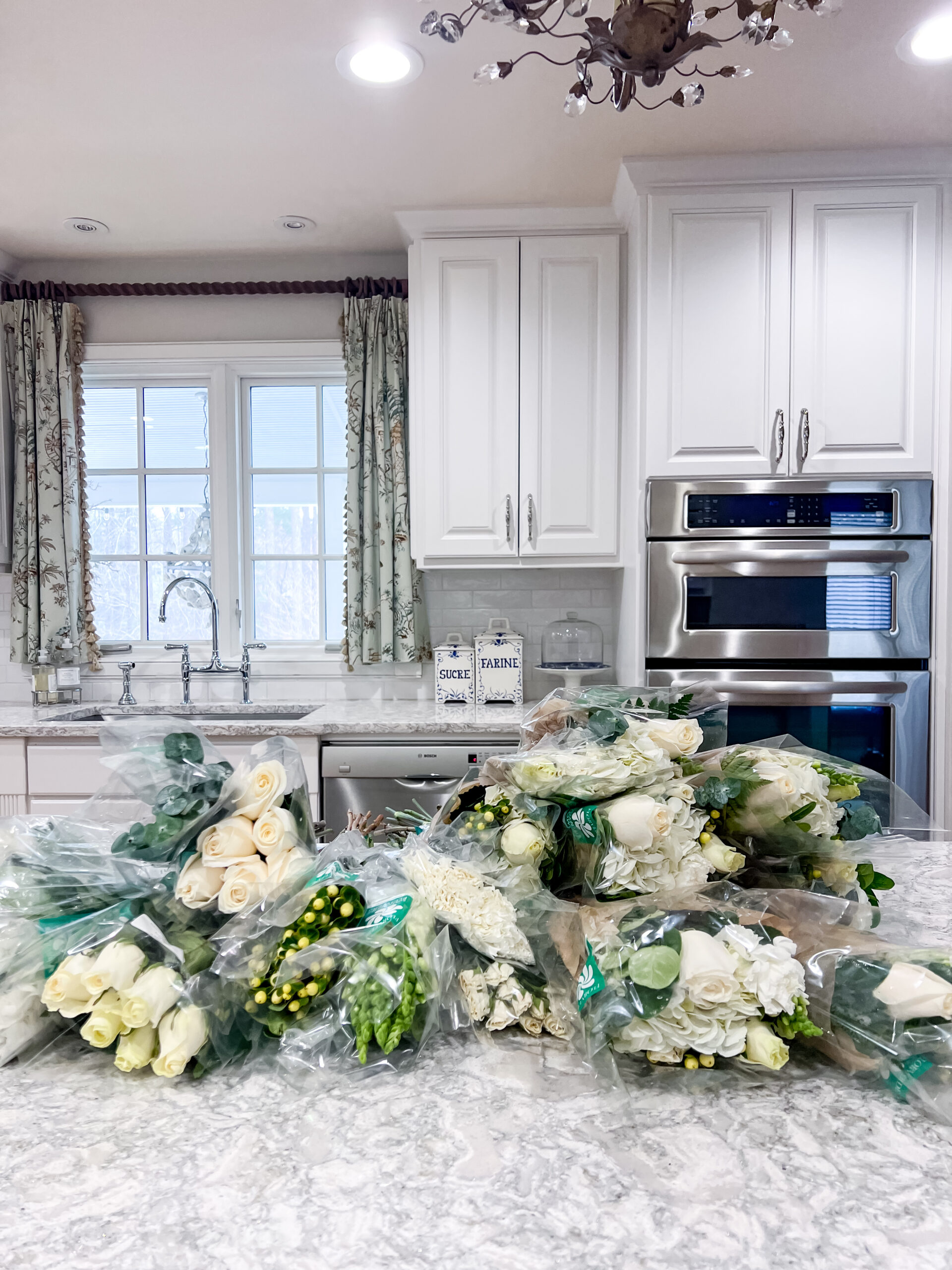 The rest of the flowers I used to create larger arrangements for the island and dining table, along with smaller ones throughout the den, foyer, and living room.