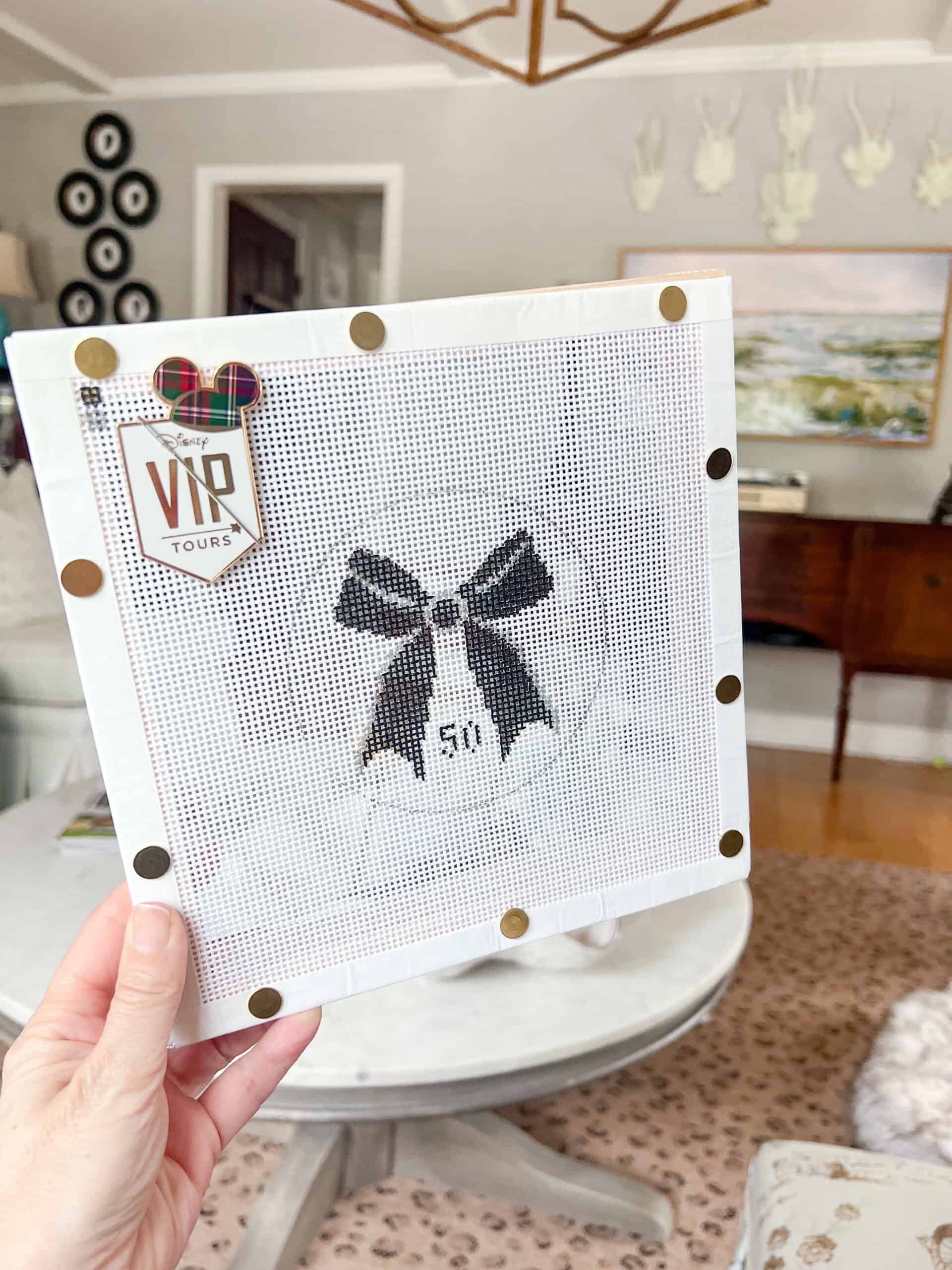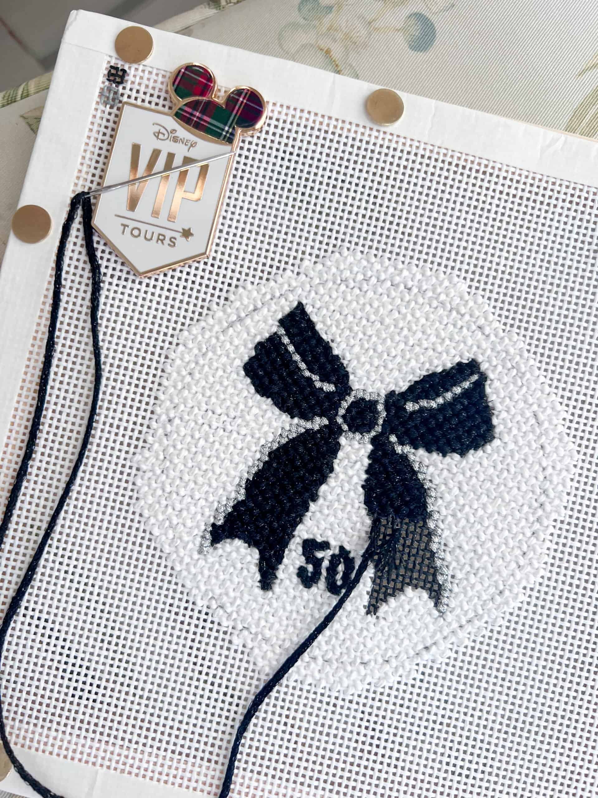I’m also nearly done with the black bow she painted as a memento from my 50th birthday. I absolutely adore this one and am very proud of how it’s turning out. I poured through my stitch book to chose the prettiest options for what I envisioned and I LOVE how the bow is a bit puffy. I’ll eventually have it finished as a Christmas ornament, which makes it even more special.