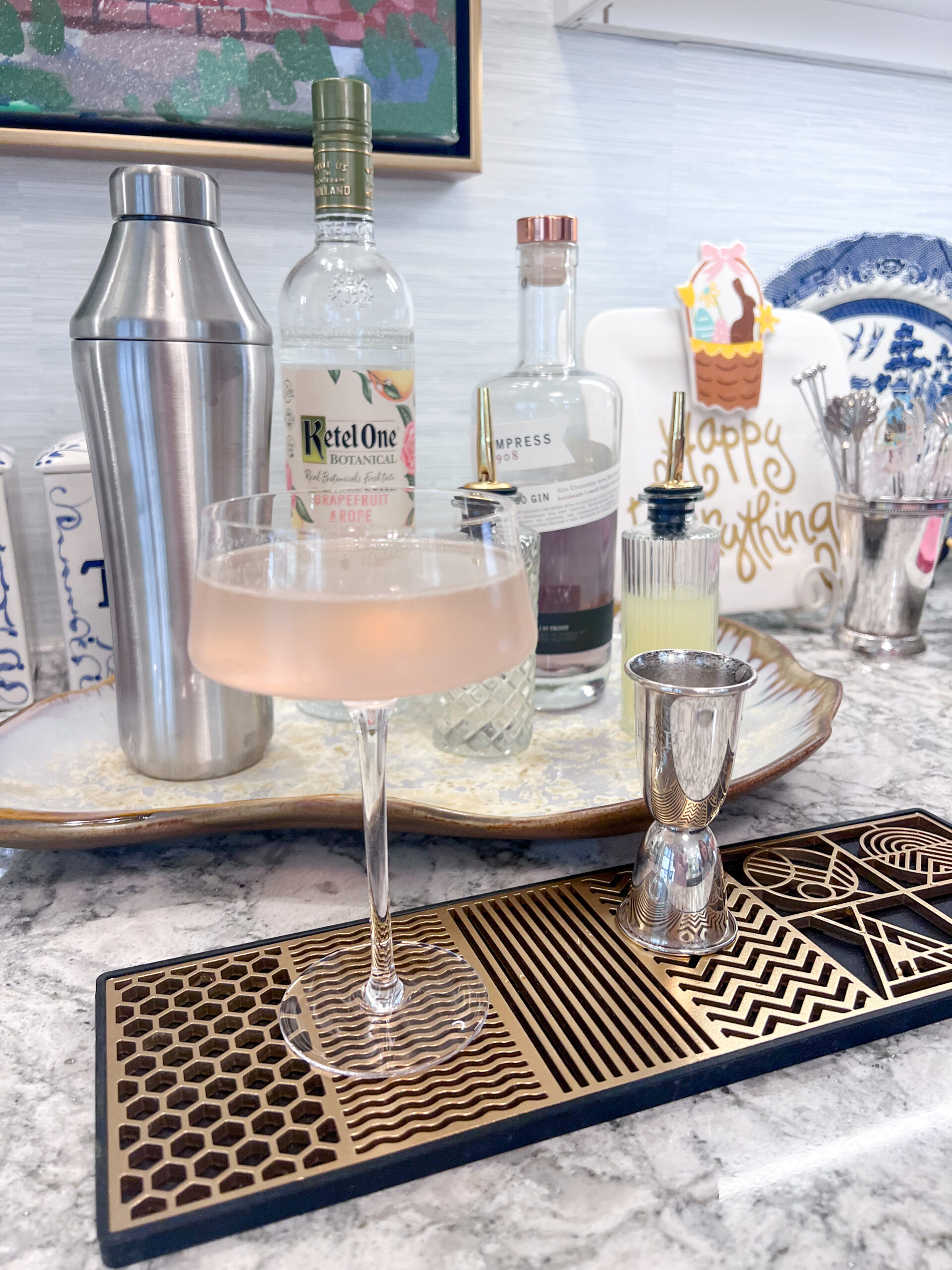 A sweet friend gave me the prettiest ice stamp tray for my birthday, and while this cocktail didn’t actually call for ice, I still loved having a reason to use it for the first of what I know will be many occasions. I cannot wait to try out the ice stamp feature, but it worked great as a bar mat too!